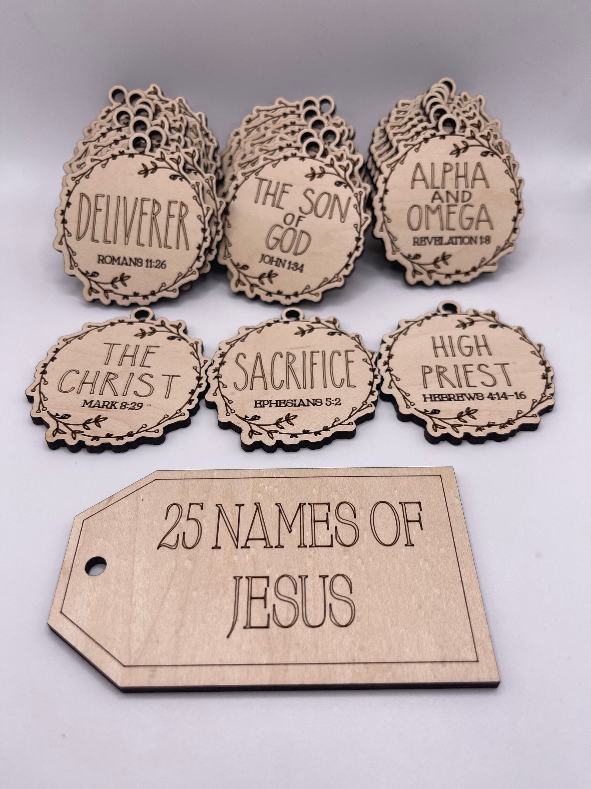 This purchase includes 25 ornaments, each engraved with a different name of Jesus. It also includes a tag engraved with the 25 Names of Jesus. This collection of ornaments will be cherished and can be used to decorate a variety of items, including a small tree, a hanging banner, wreath, etc. Each ornament also names a scripture verse where you can find that name referenced in the Bible.