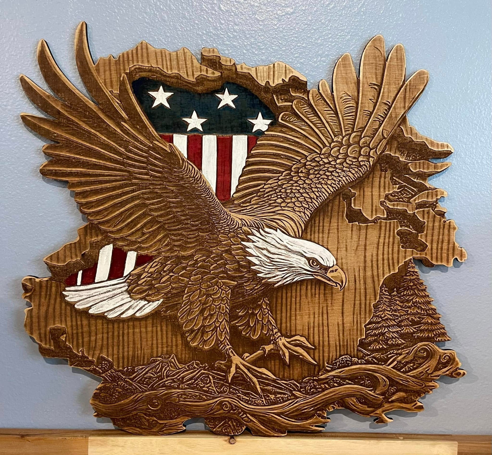 3D Bald Eagle, USA Flag, Laser engraved wall hanging