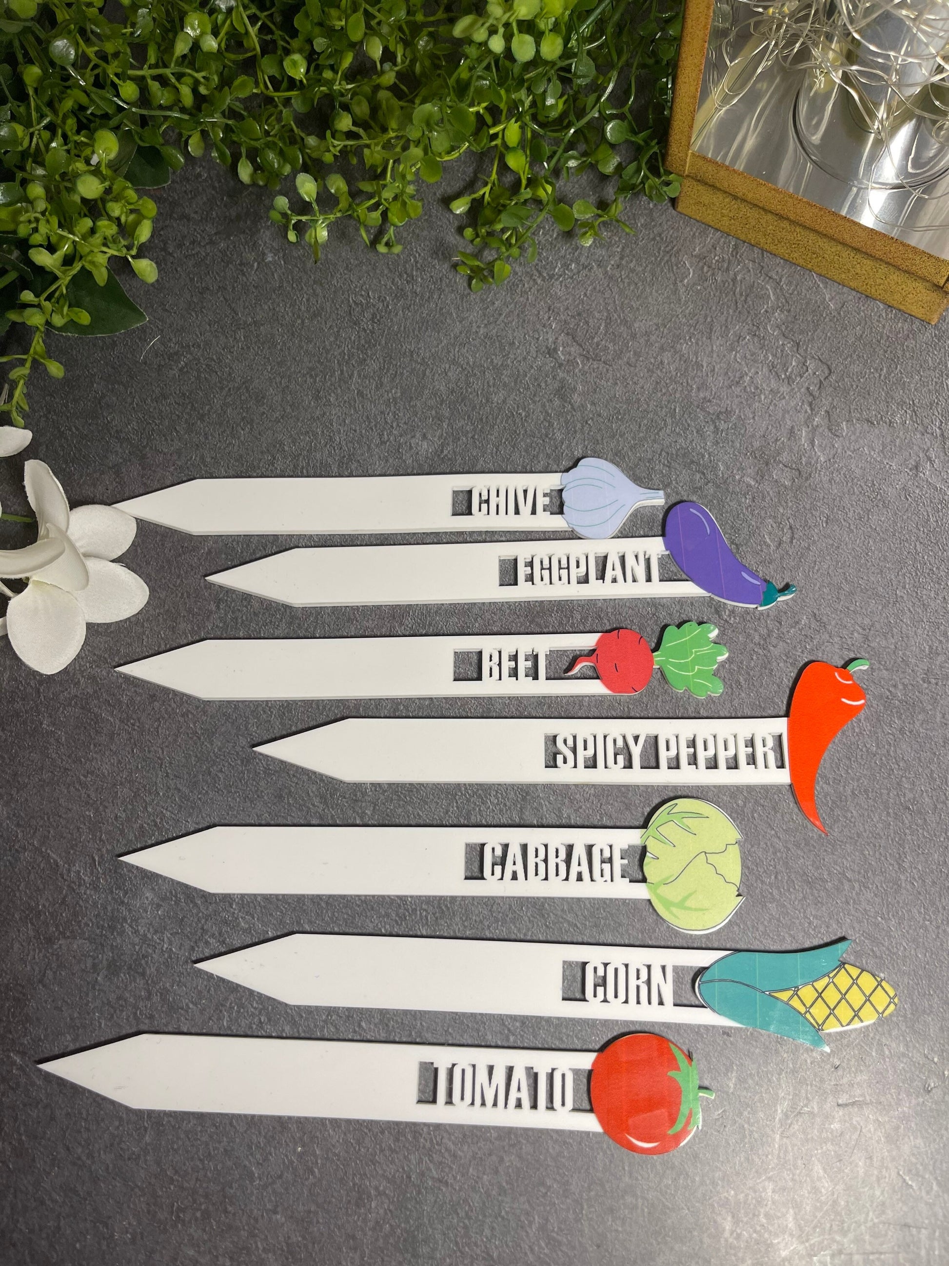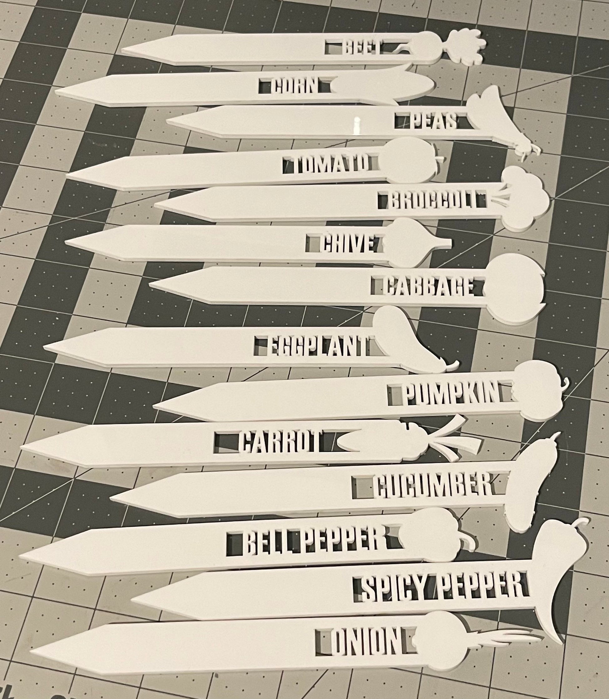 No more guessing what seeds were planted where when you use these garden stakes to identify the rows. Place your order now so you have them before you start your spring planting! The stakes are 8" tall and have the name of the plant cut into the stake. The top of the stake has a drawing of the plant, to help identify the plant easily. You can choose between wood or acrylic (longer lasting).