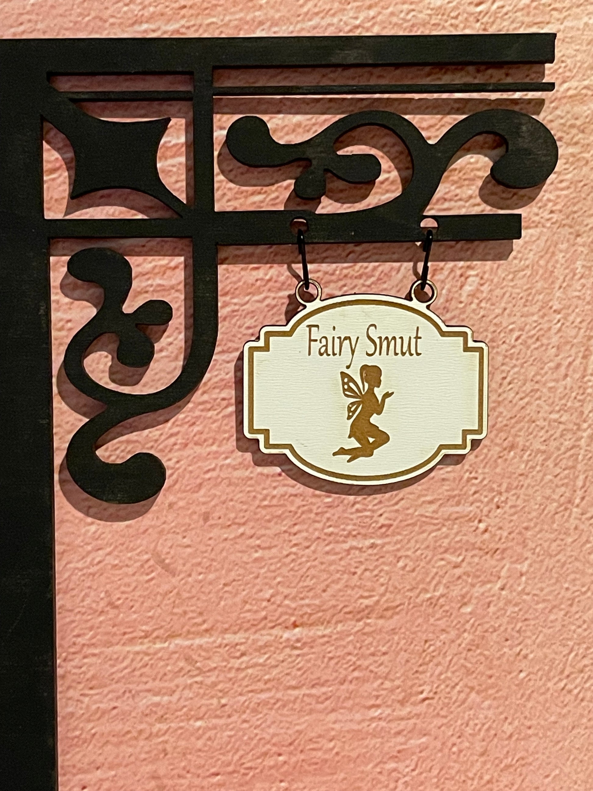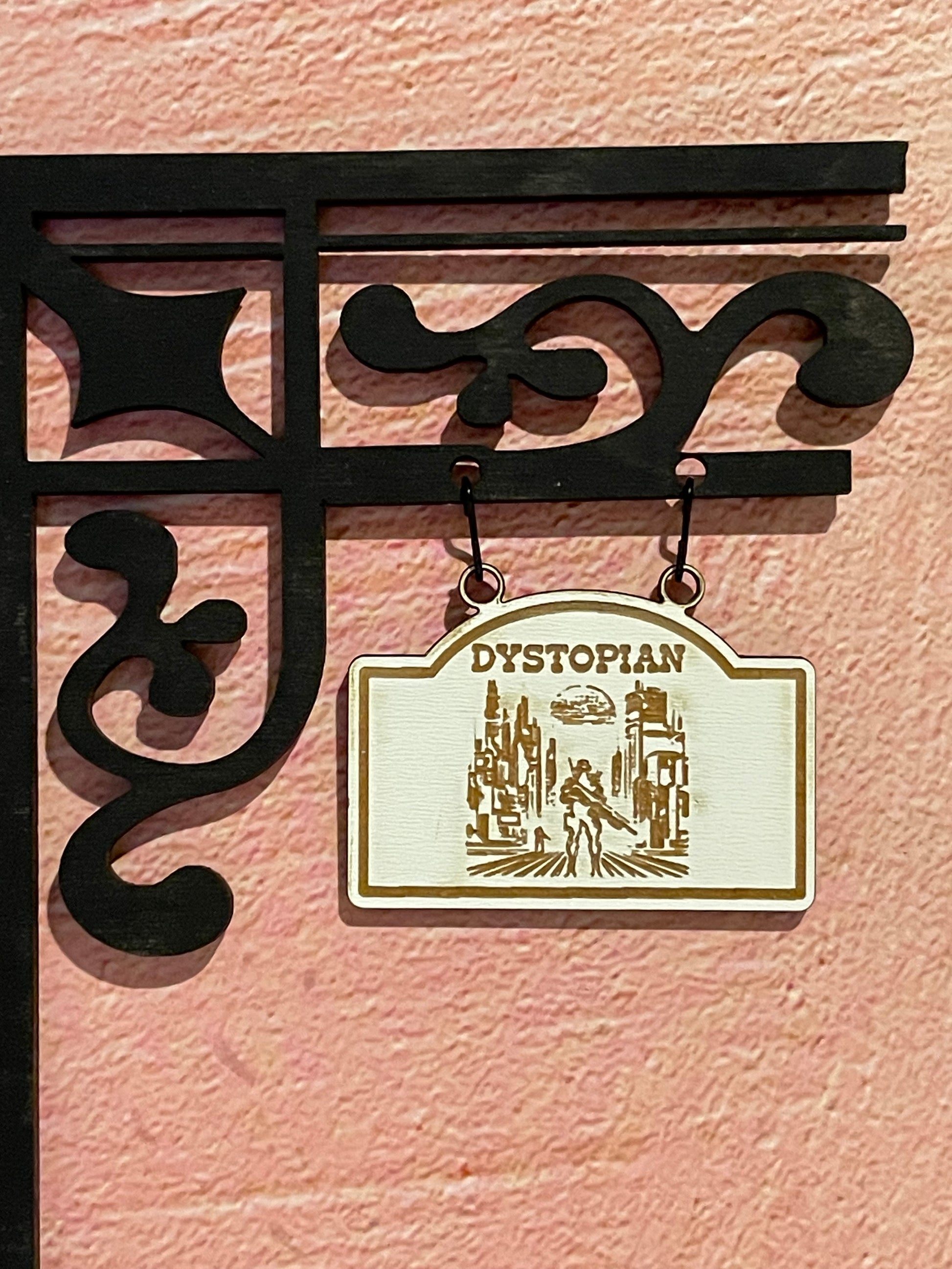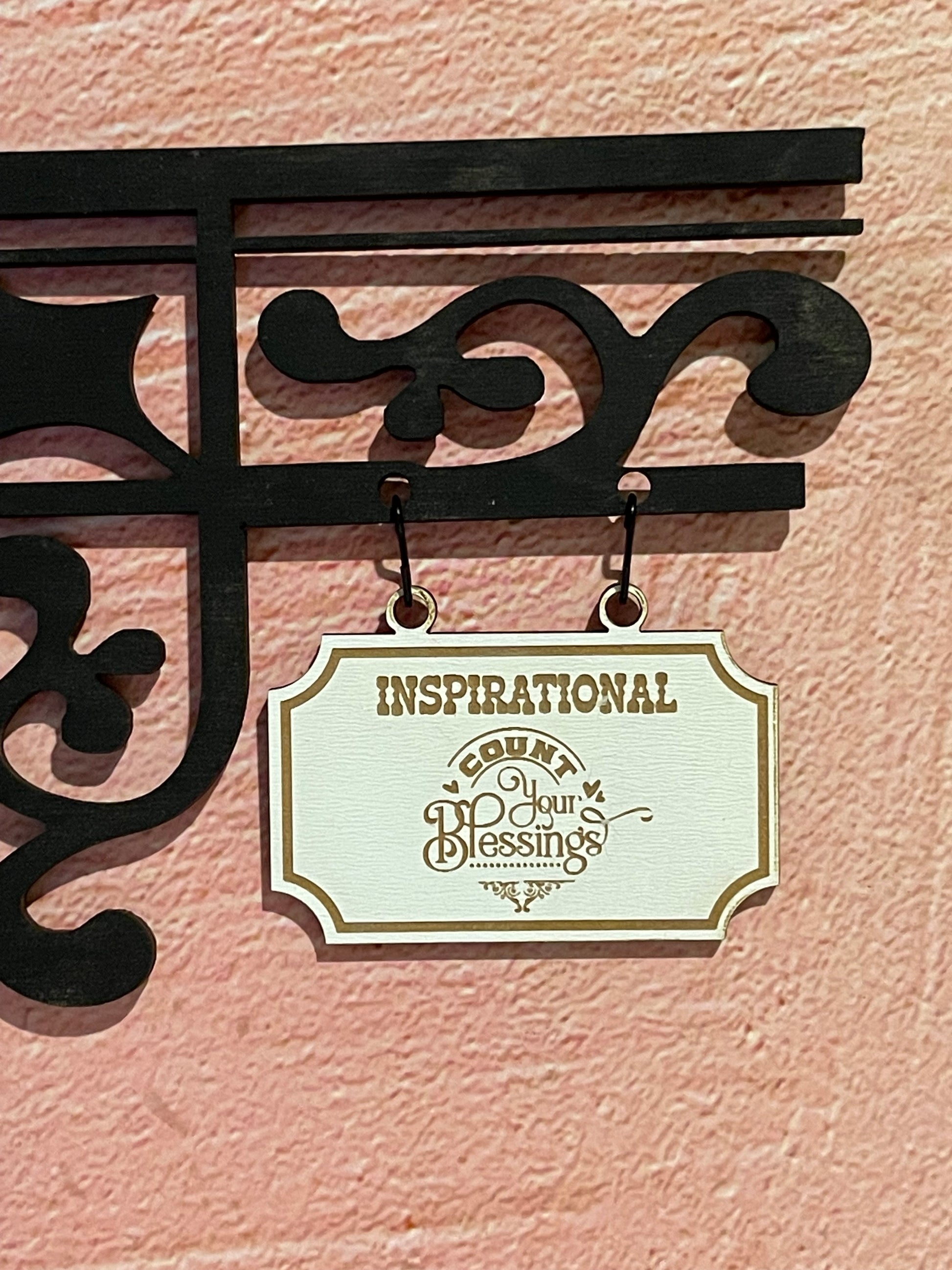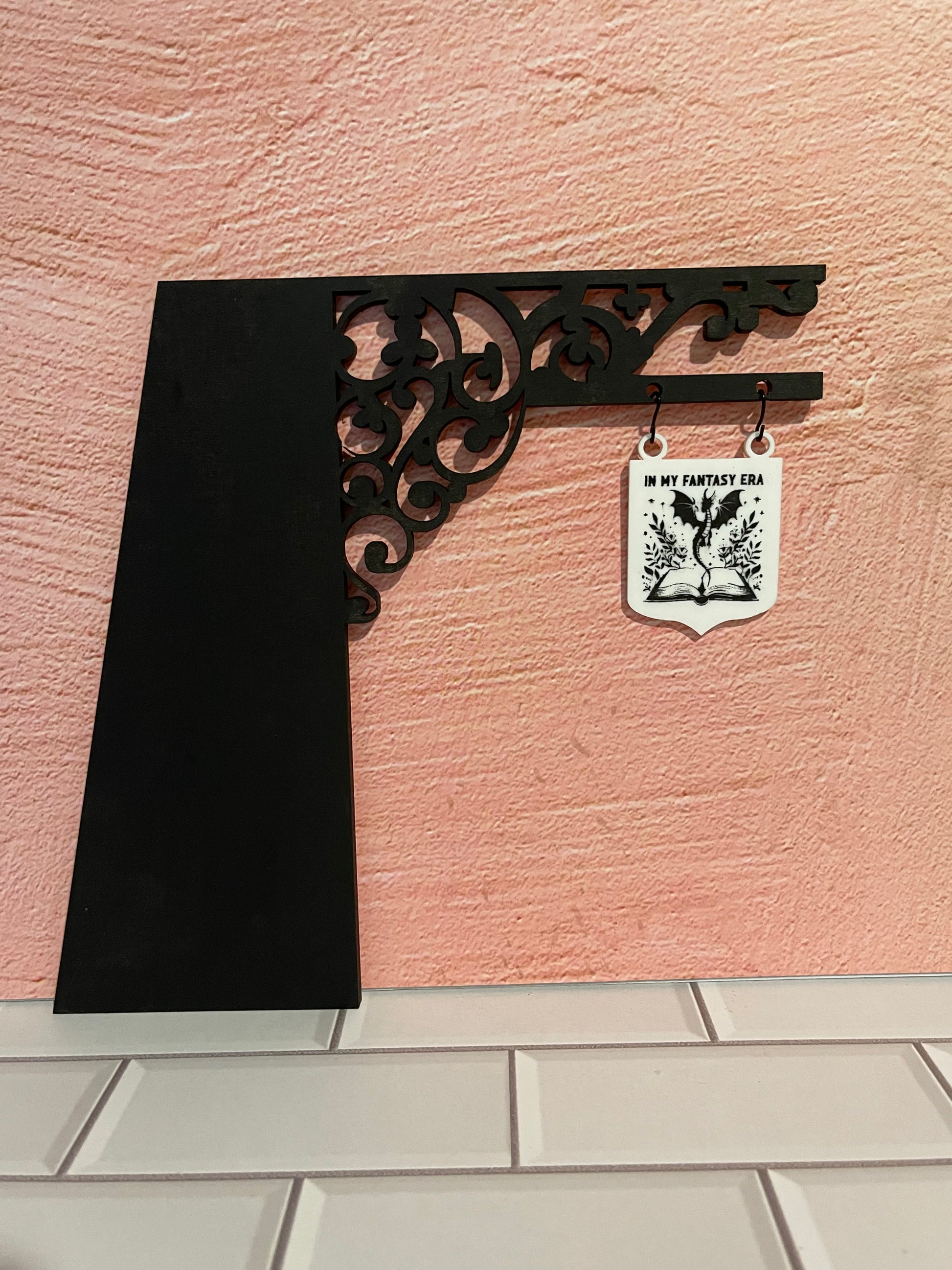 There are two material options for the white hanging signs. You can choose white MDF, which has the design engraved on the white painted side. Or you can choose the white acrylic, which has the design engraved on both sides. This is often preferred so the sign design is visible from either side of the bookshelf.