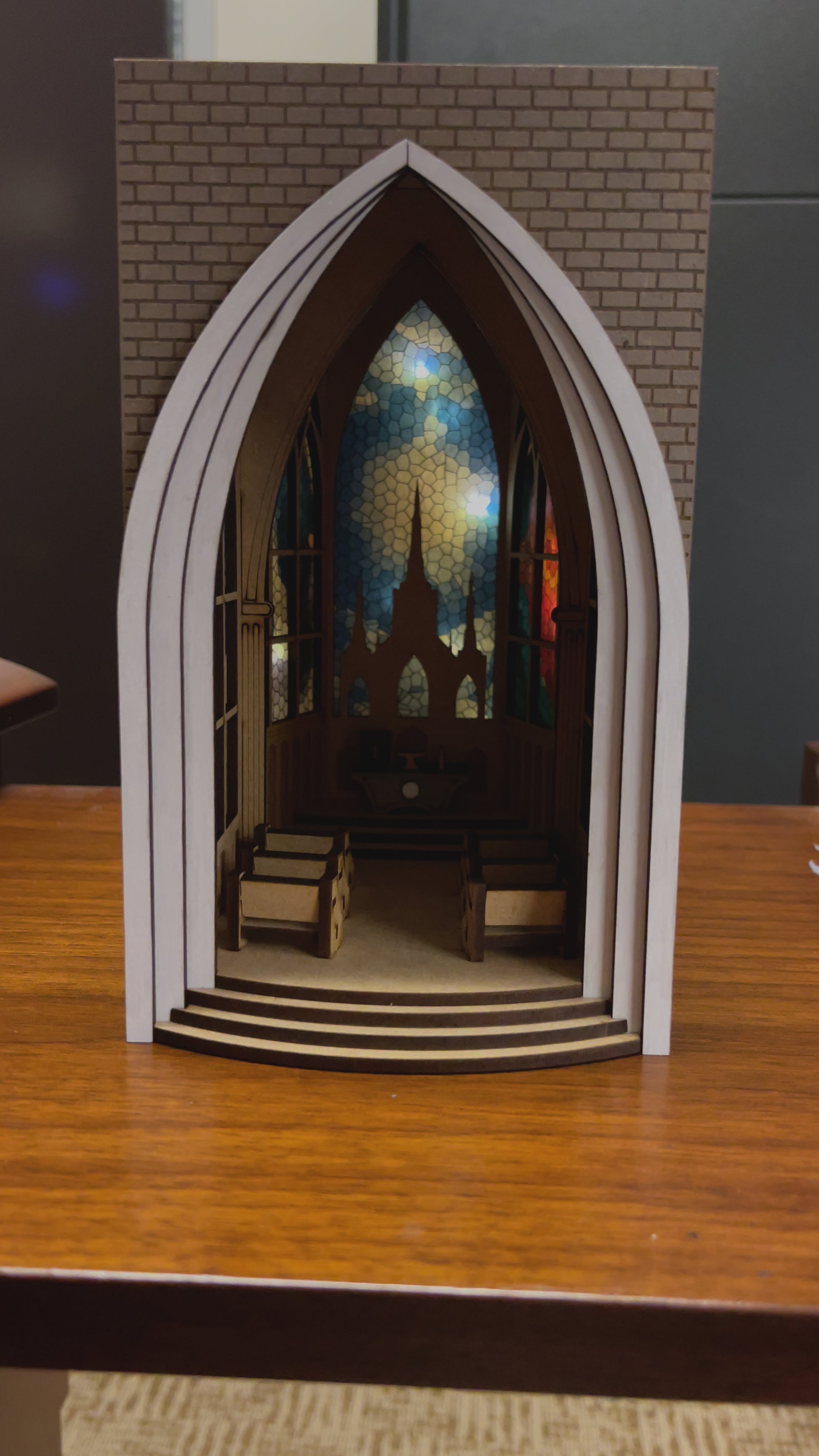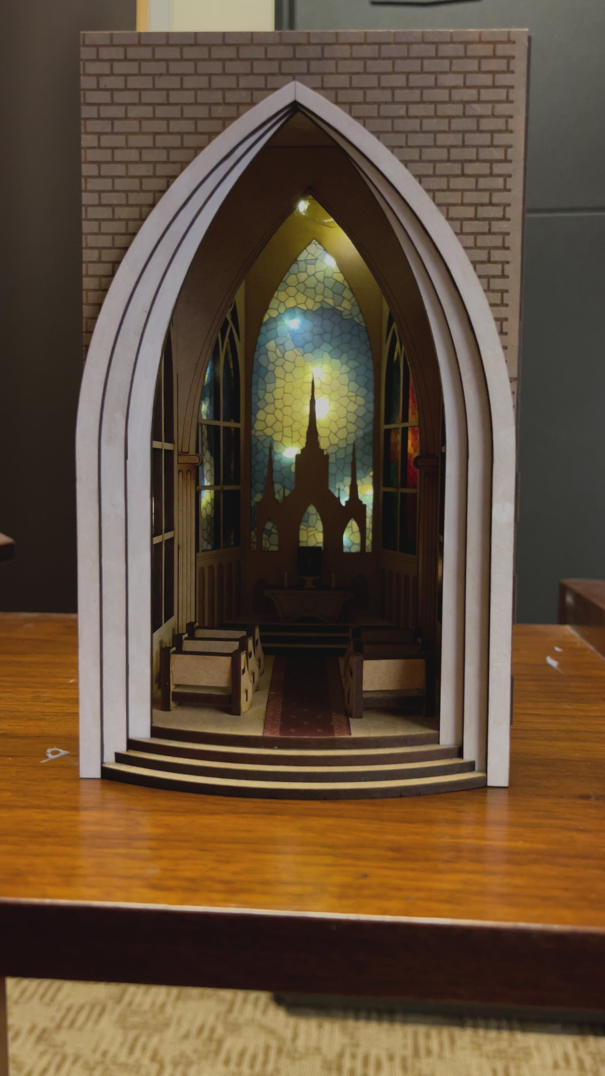 Introducing the Cathedral Church Book Nook, a stunning piece that showcases the intricate beauty of stained glass illusion windows and the solemnity of faith. Featuring two rows of pews, a Bible on the alter, and warm lights behind the windows, it creates the perfect ambiance for spiritual contemplation and reading. Elevate your home decor with this unique and meaningful book nook. The exterior is a light gray wash with white painted arches welcoming you to the sanctuary. You can choose to have a red "rug" runner between the pew isles or to leave it bare.