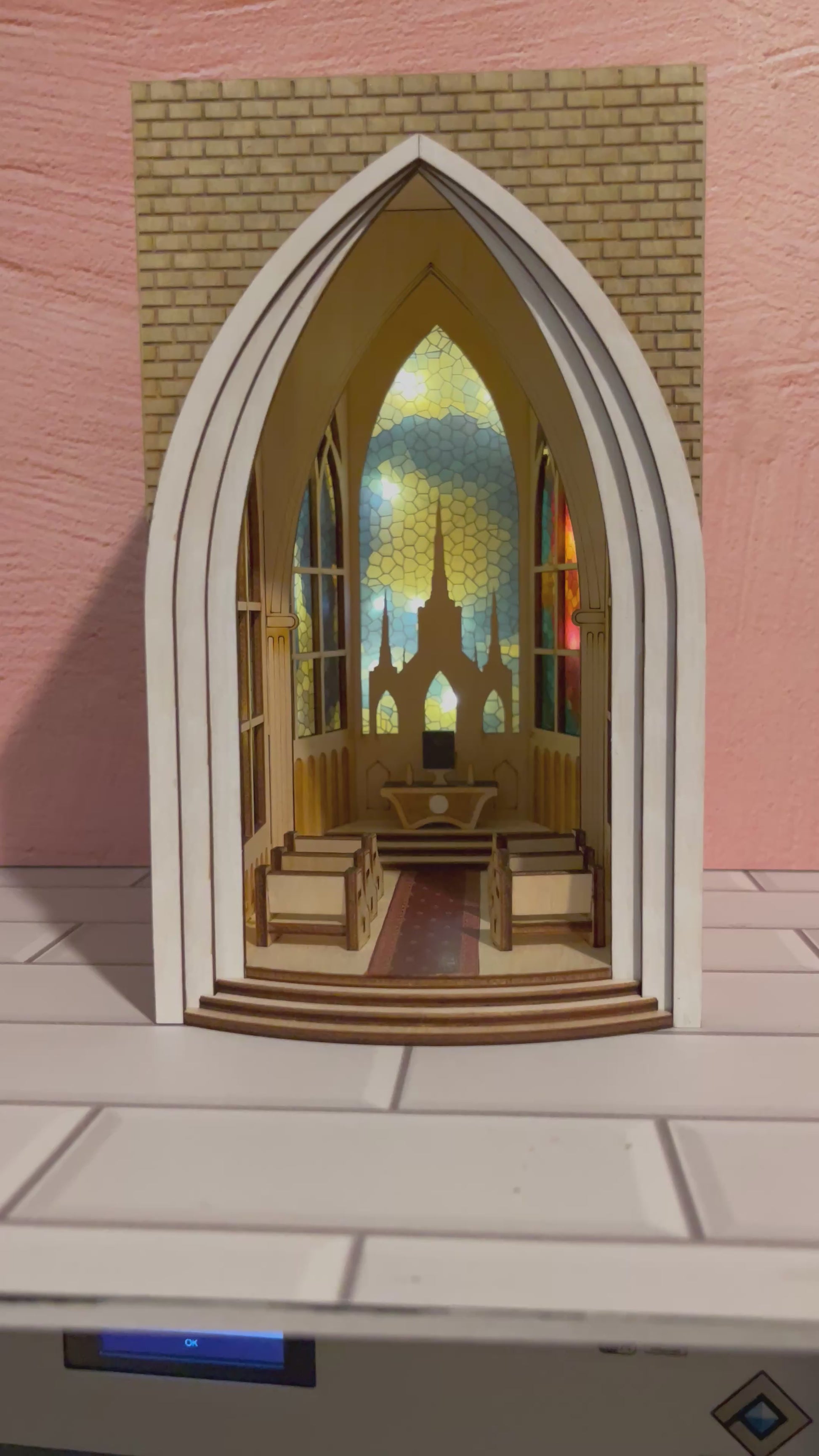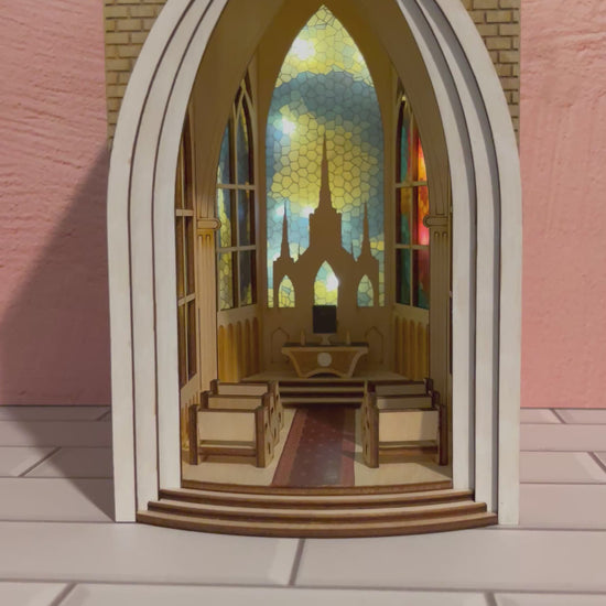 Introducing the Cathedral Church Book Nook, a stunning piece that showcases the intricate beauty of stained glass illusion windows and the solemnity of faith. Featuring two rows of pews, a Bible on the alter, and warm lights behind the windows, it creates the perfect ambiance for spiritual contemplation and reading. Elevate your home decor with this unique and meaningful book nook. The exterior is a light gray wash with white painted arches welcoming you to the sanctuary.
