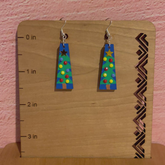 These holiday dangle earrings showcase a handpainted wooden tree adorned with carefully attached acrylic ornaments, creating a festive and detailed design. Both sides are painted and decorated, ensuring a polished look from every angle. Lightweight yet durable, they offer a sophisticated way to celebrate the season with wearable art.