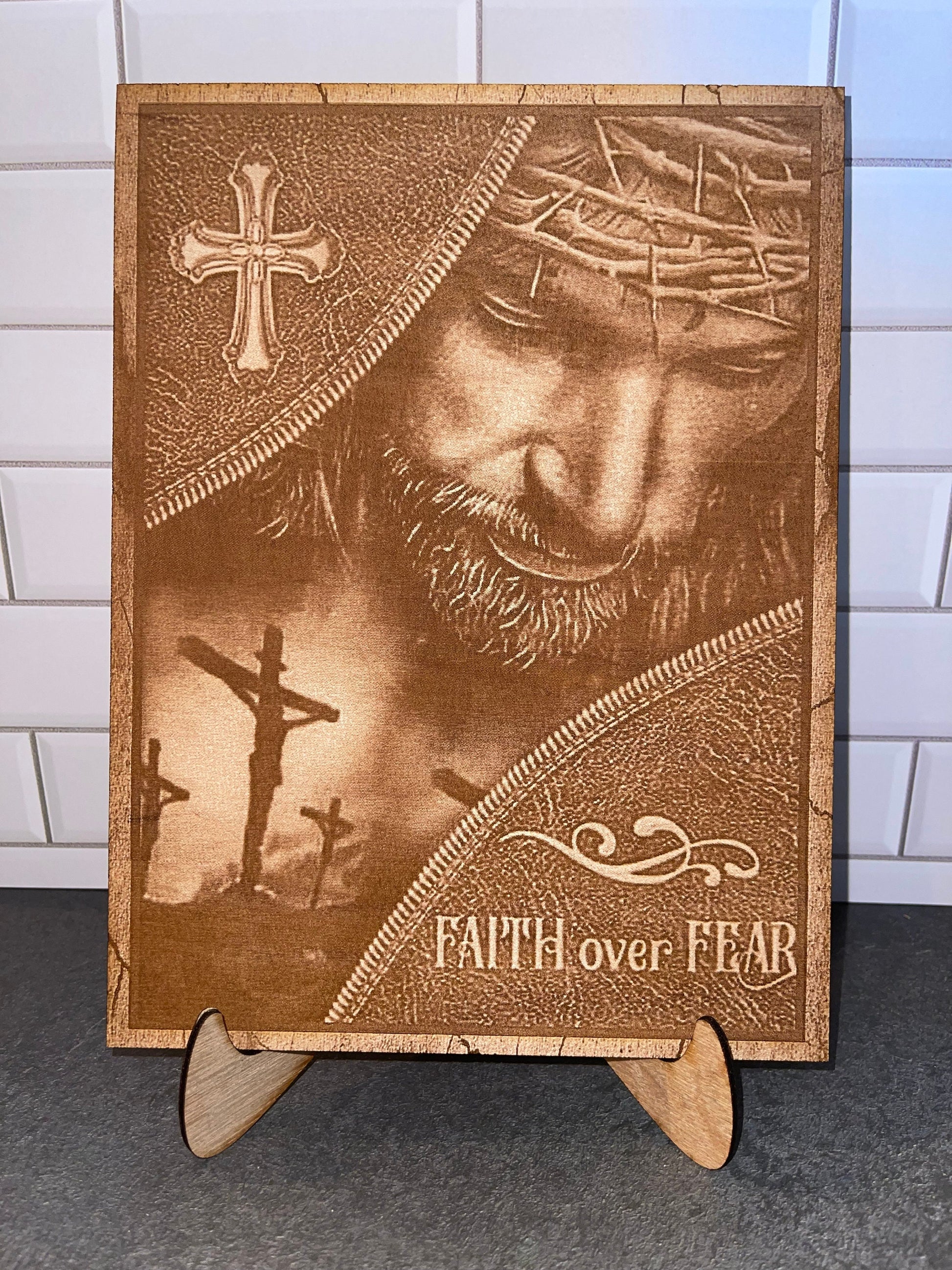 Faith Over Fear, Jesus sign, laser engraving with stand; God's son