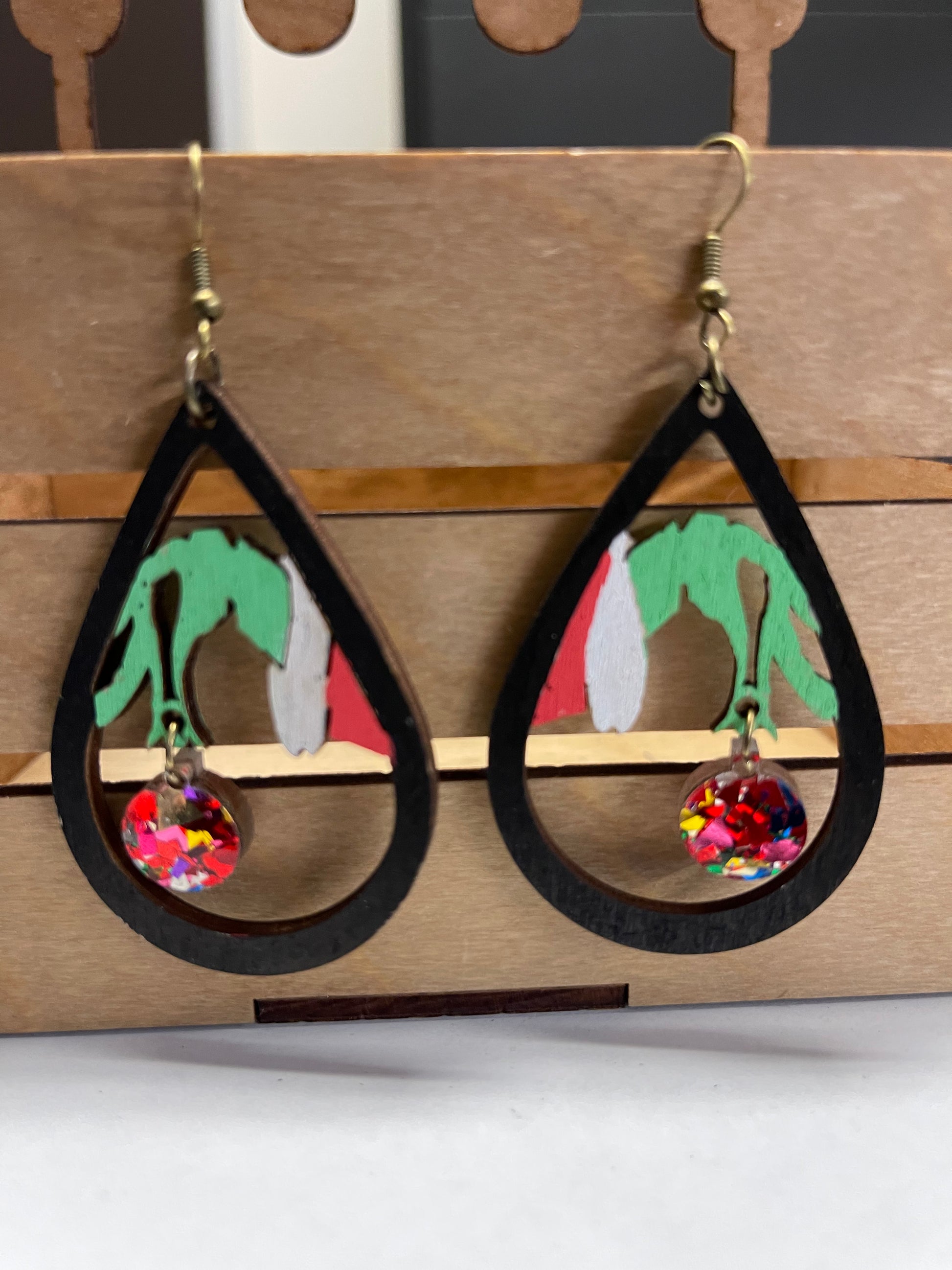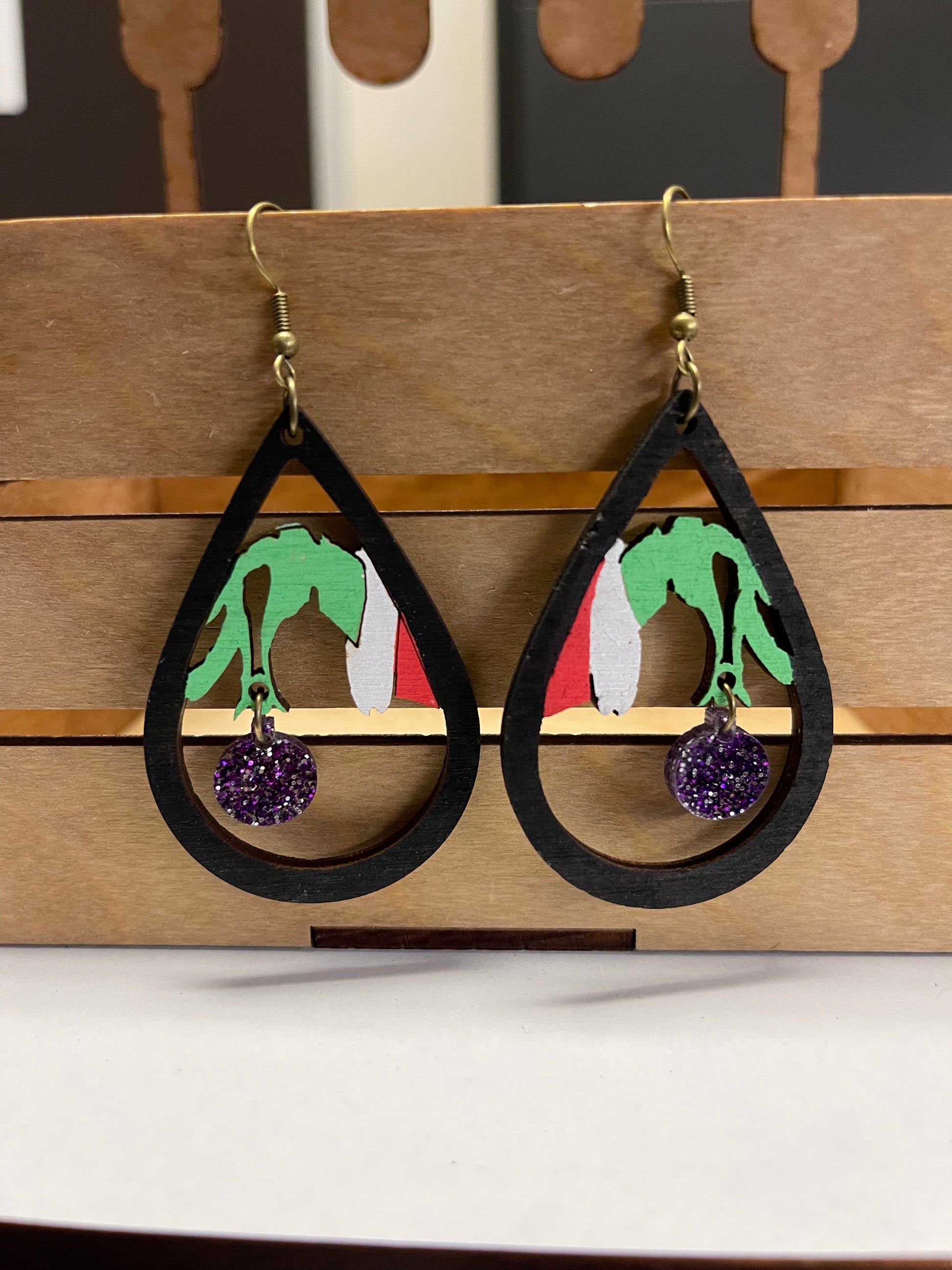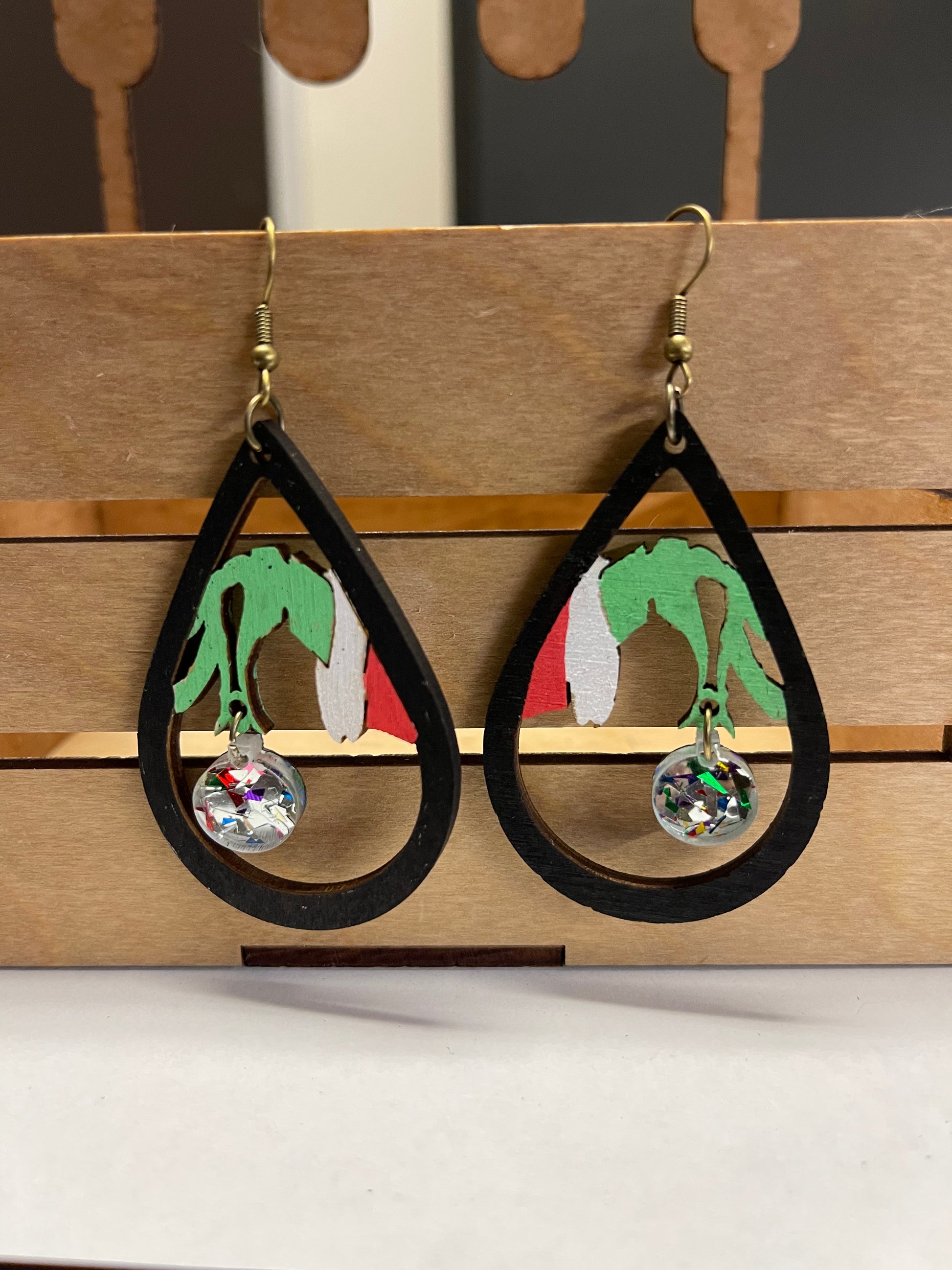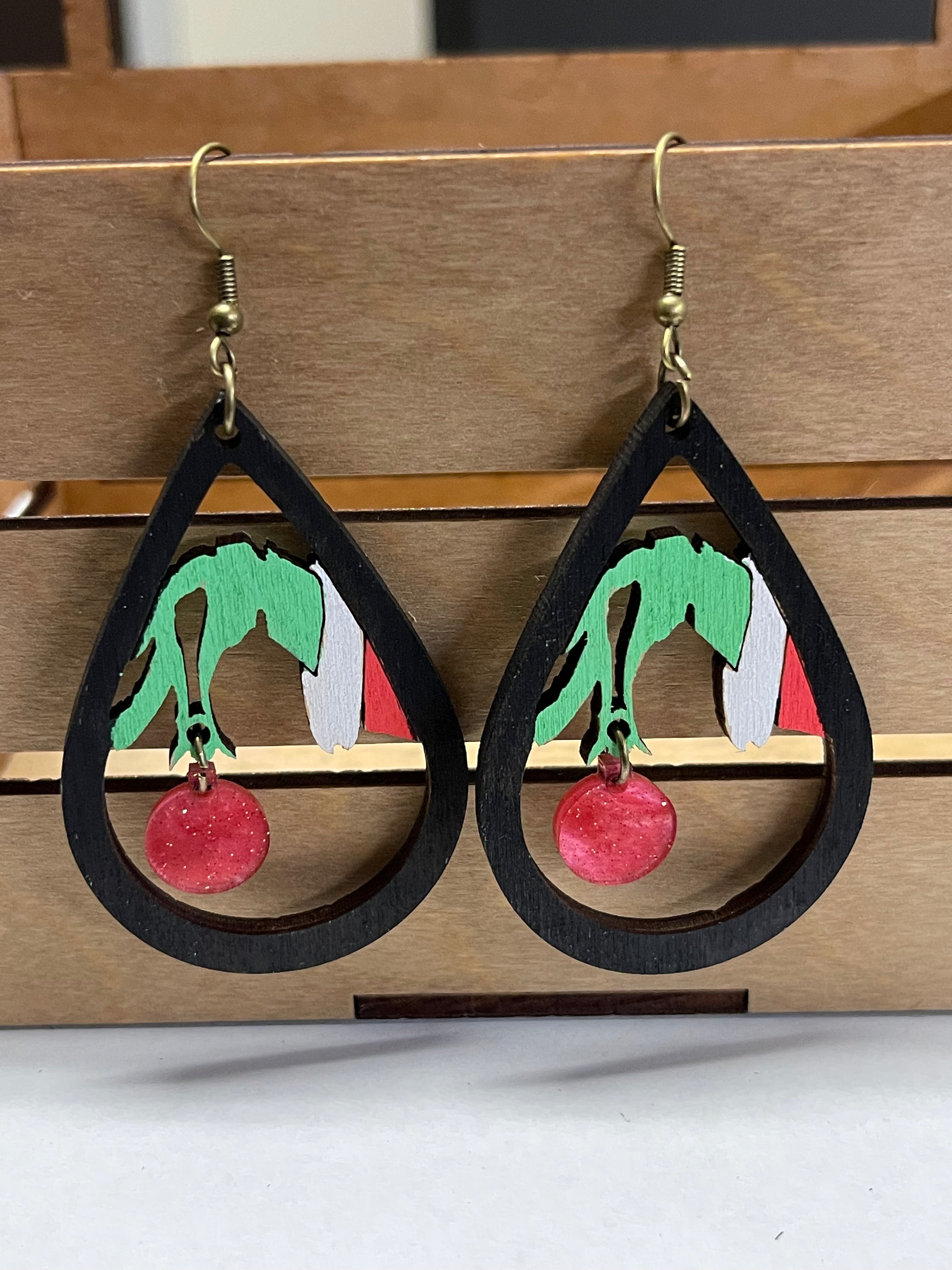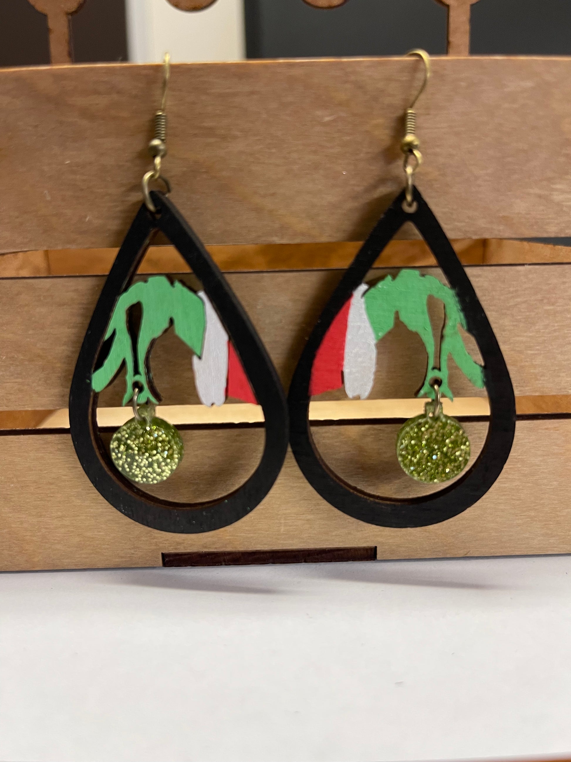 Introducing our Grinch Hand Dangle Earrings - a must-have for any fan of the classic holiday story! These unique earrings feature the Grinch's iconic fingers holding onto a colorful acrylic ornament. Made with quality wood and acrylic materials, these earrings measure 2.5" in length. Add some festive flair to your wardrobe with these fantastic dangle earrings!
