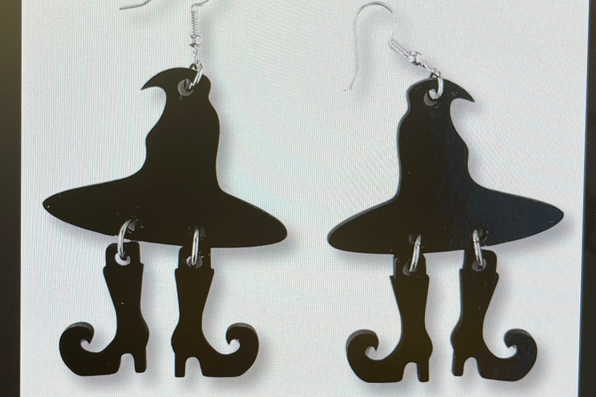 These witch earrings are a perfect accessory for Halloween. Crafted from acrylic, the earrings feature a fun design with dangling boots that swing as you move. Add a touch of whimsy to your costume with these festive earrings.