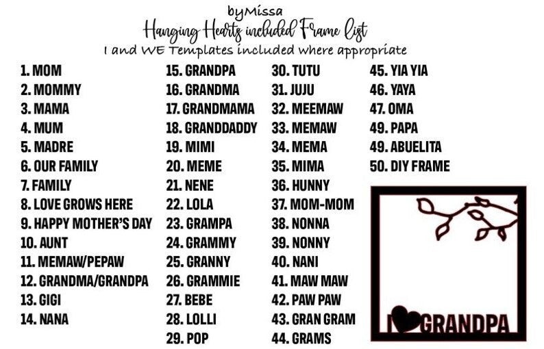 This sign is the perfect gift for anyone, but will especially be a hit for Mother's Day, Father's Day, Grandparent's Day, a birthday, or a wedding gift. You can choose from 50 different frames (see the options in the photos) as well as personalizing the names in the hearts. You can choose between 1 and 25 hearts. An easel is included.