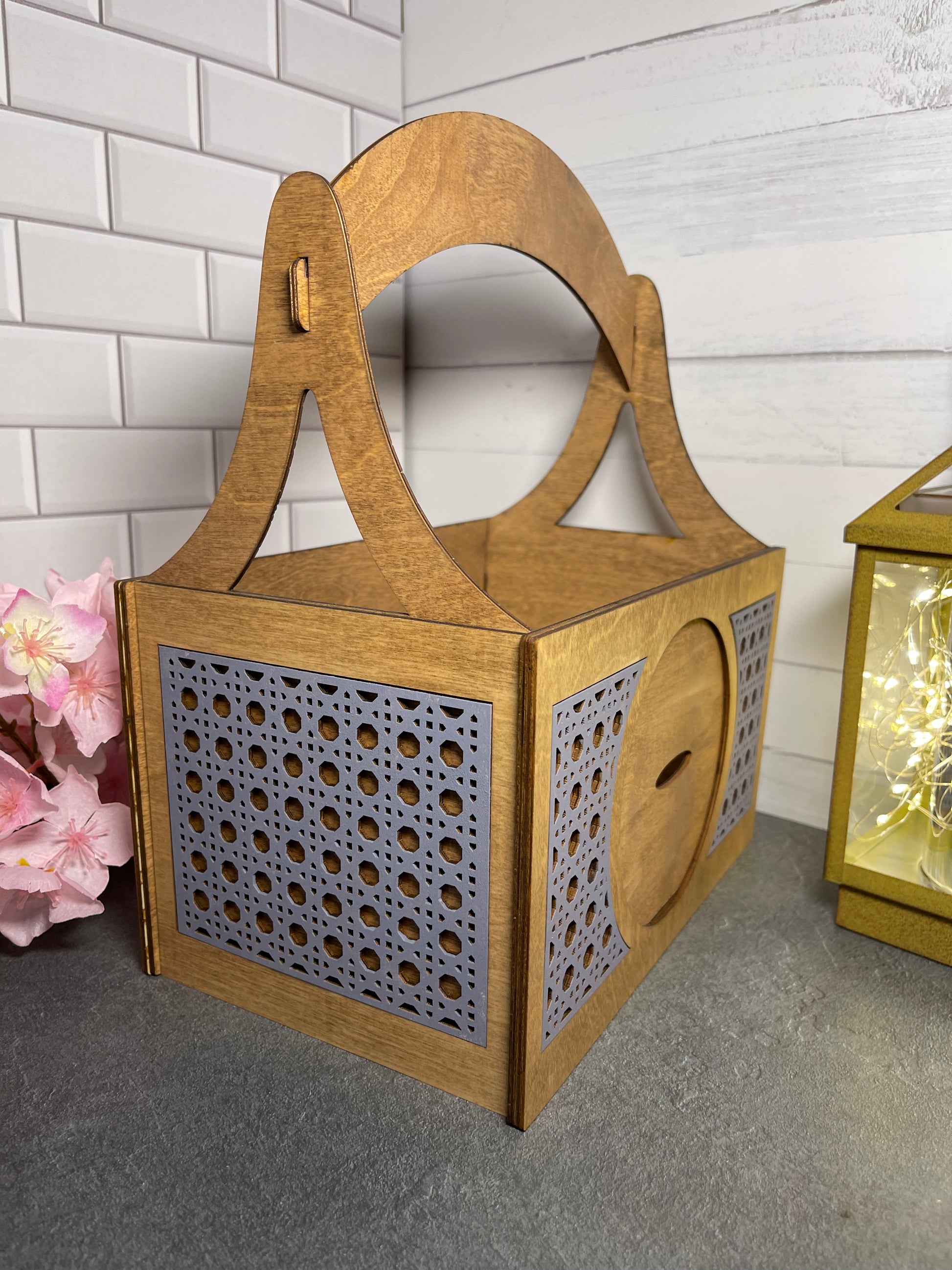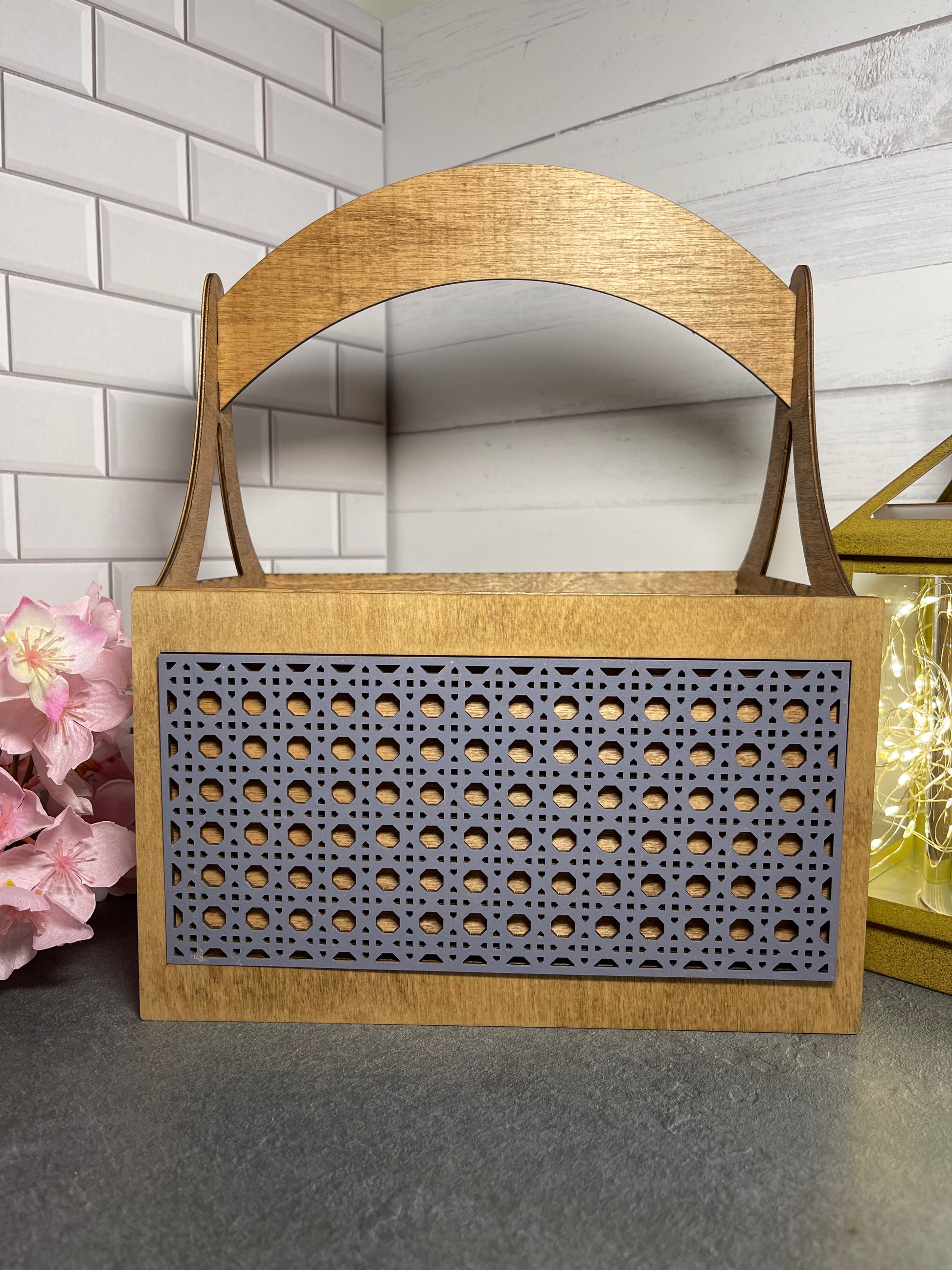 Expertly handmade and laser cut, this interchangeable basket add a unique touch to any display or make a thoughtful gift. Swap out the disc for different designs and showcase your style on the front of each basket. Each disc attaches to the basket by velcro, which is how you can change out the discs for a new look, all while using the same basket. Handcrafted for a personalized touch.