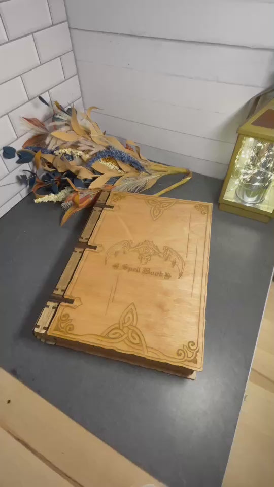 Expertly crafted from wood, this large book box features a laser cut design and an engraved "Spell Book" cover. With measurements of 11" x 8.5" x 2", it's the perfect keepsake box for storing collectibles, a unique gift box, or a stylish addition to any table or bookshelf. Its hinged lid and intricate spine make it both functional and visually appealing.
