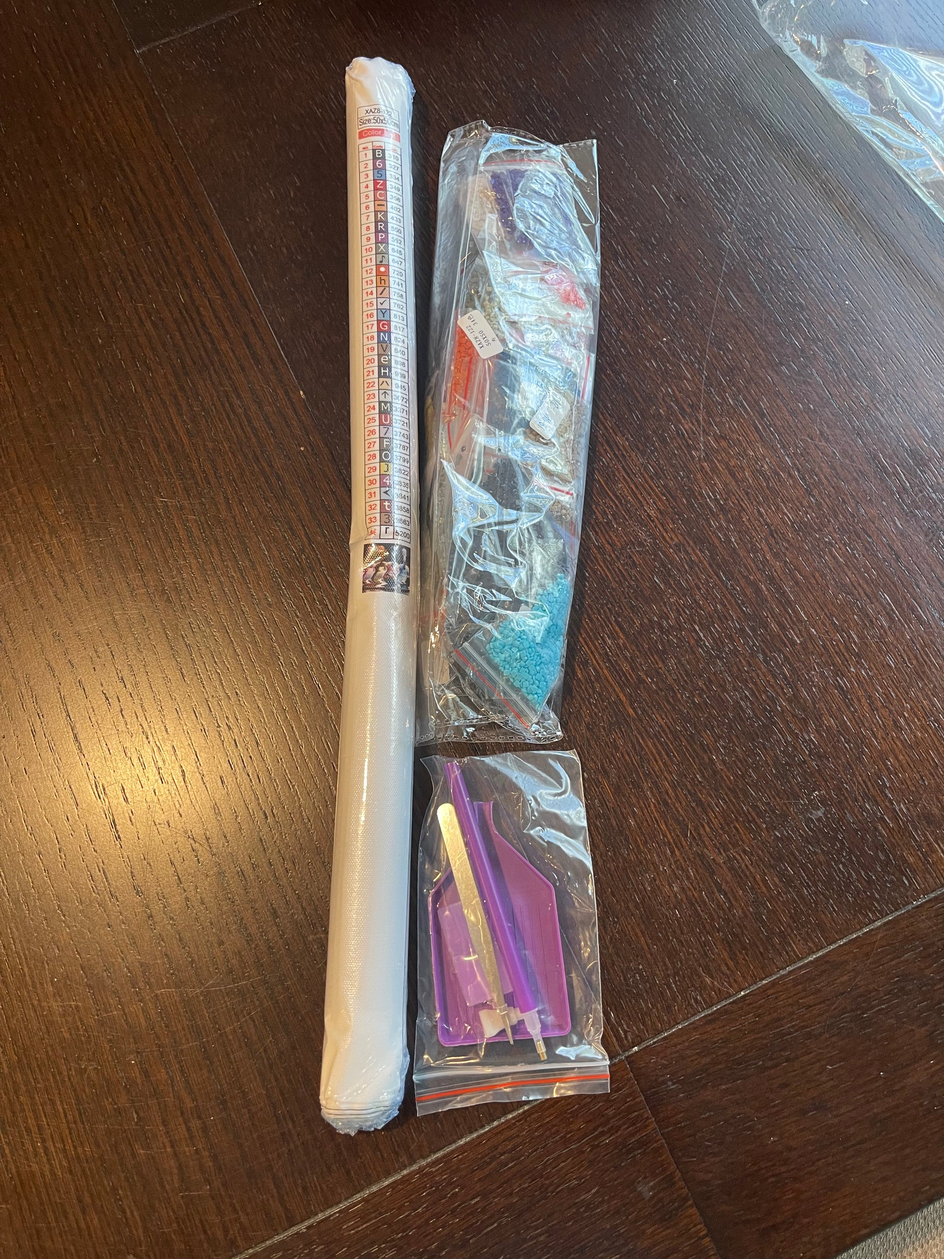 The tool kit comes with a diamond painting pen (or stylus), a sticky canvas that you'll put the diamonds on, a tray to put the diamonds in as you use each color, and wax (which your pen uses to pick up each diamond and place it on the canvas in the corresponding color), along with the diamonds to place on the canvas.