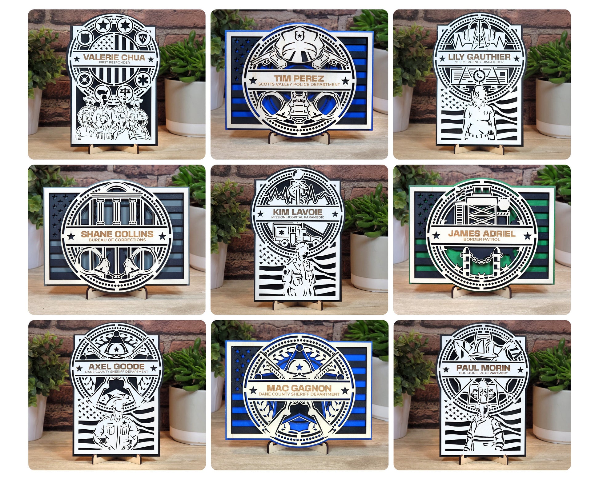 First, choose the first responder occupation you want. Then, choose between a double-layer sign or a triple-layer sign for a more 3-dimensional look. These signs are made with maple plywood. You can personalize the color for the bottom layer of the double-layer sign. If you choose the triple-layer sign, you can choose colors for the middle and bottom layers. This is a perfect way to personalize the sign even more. Just leave a comment in the personalization box for the text details you want to add and your color choices.