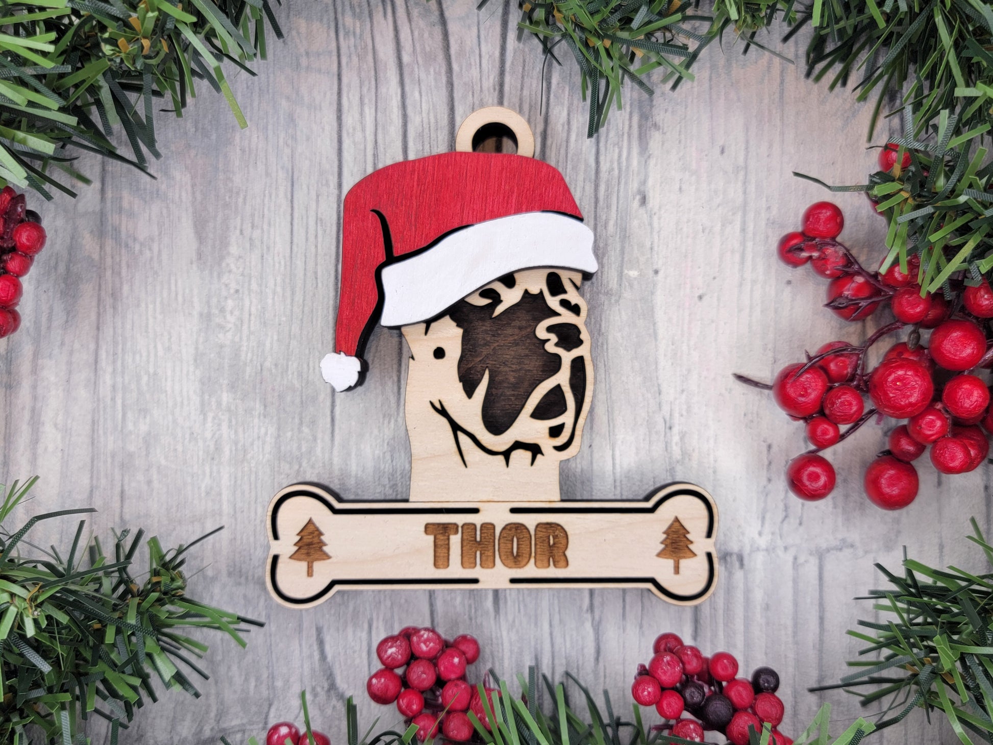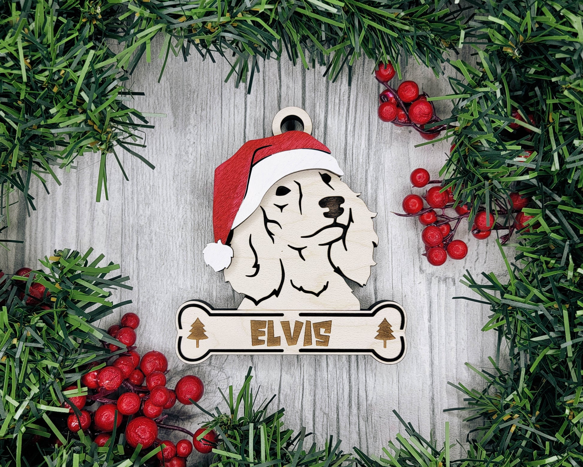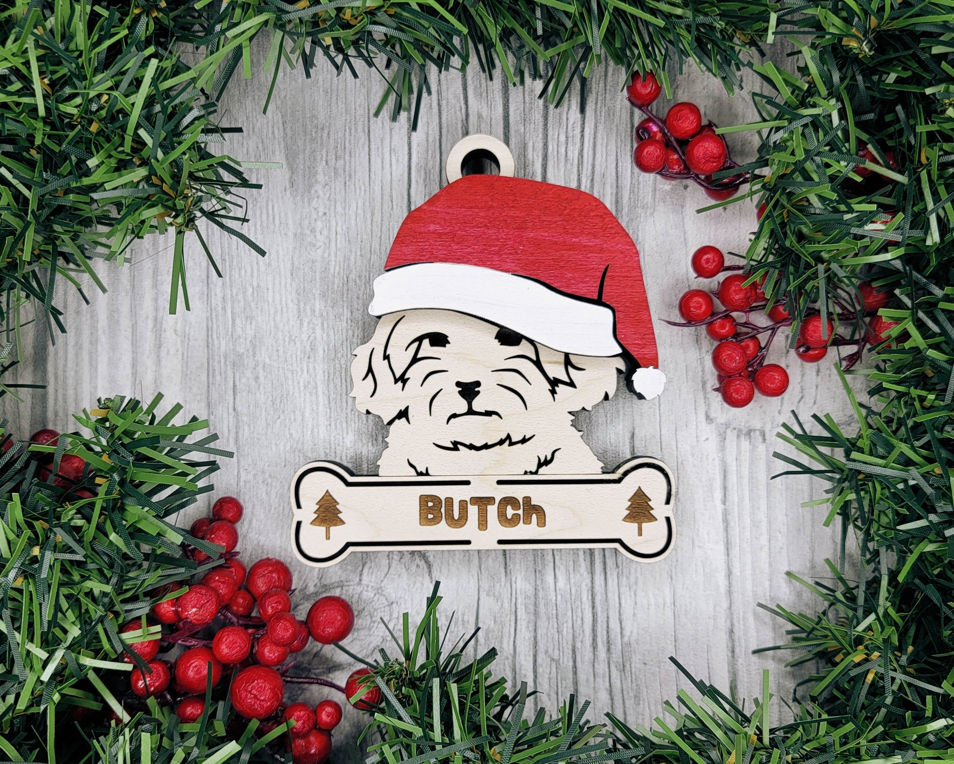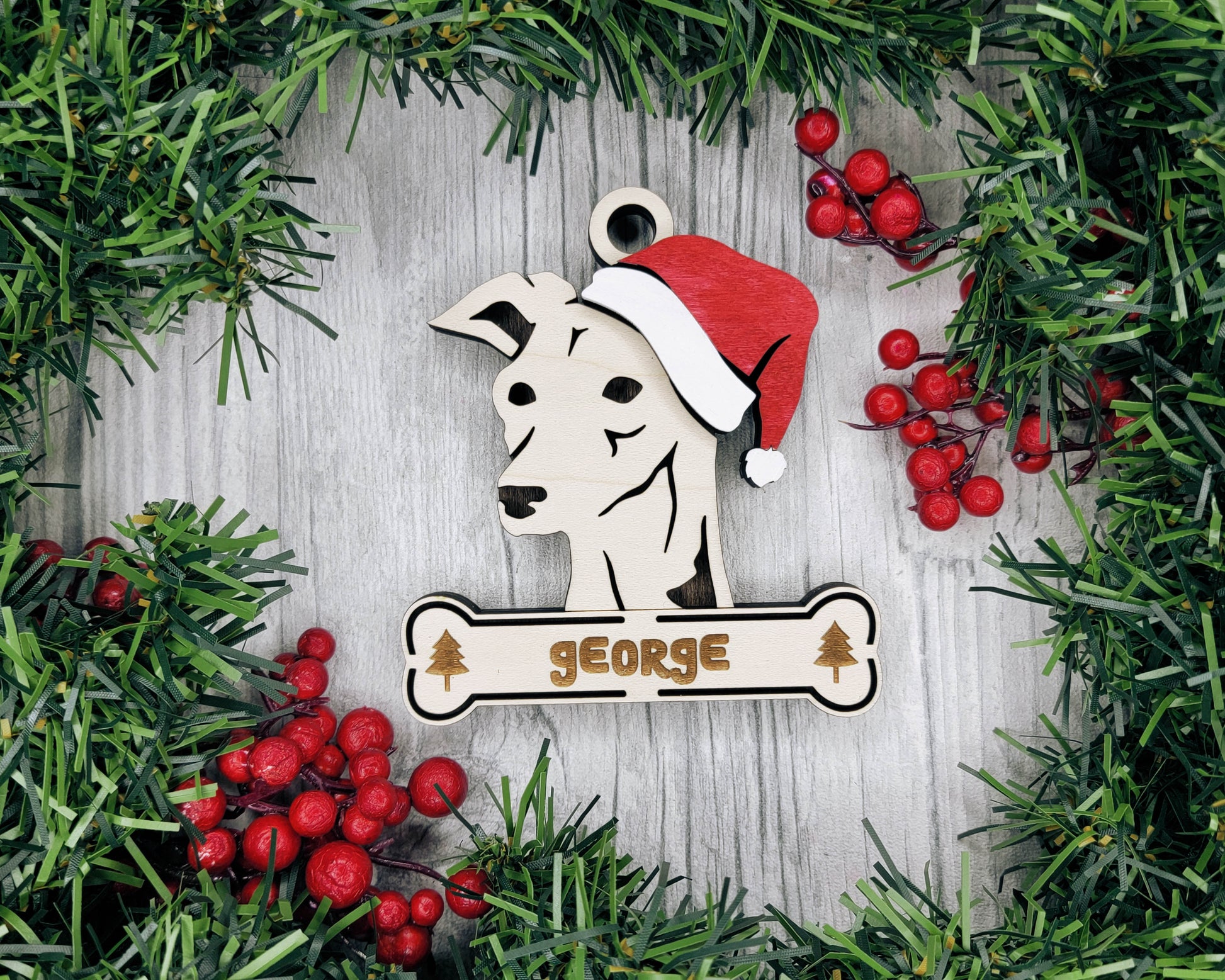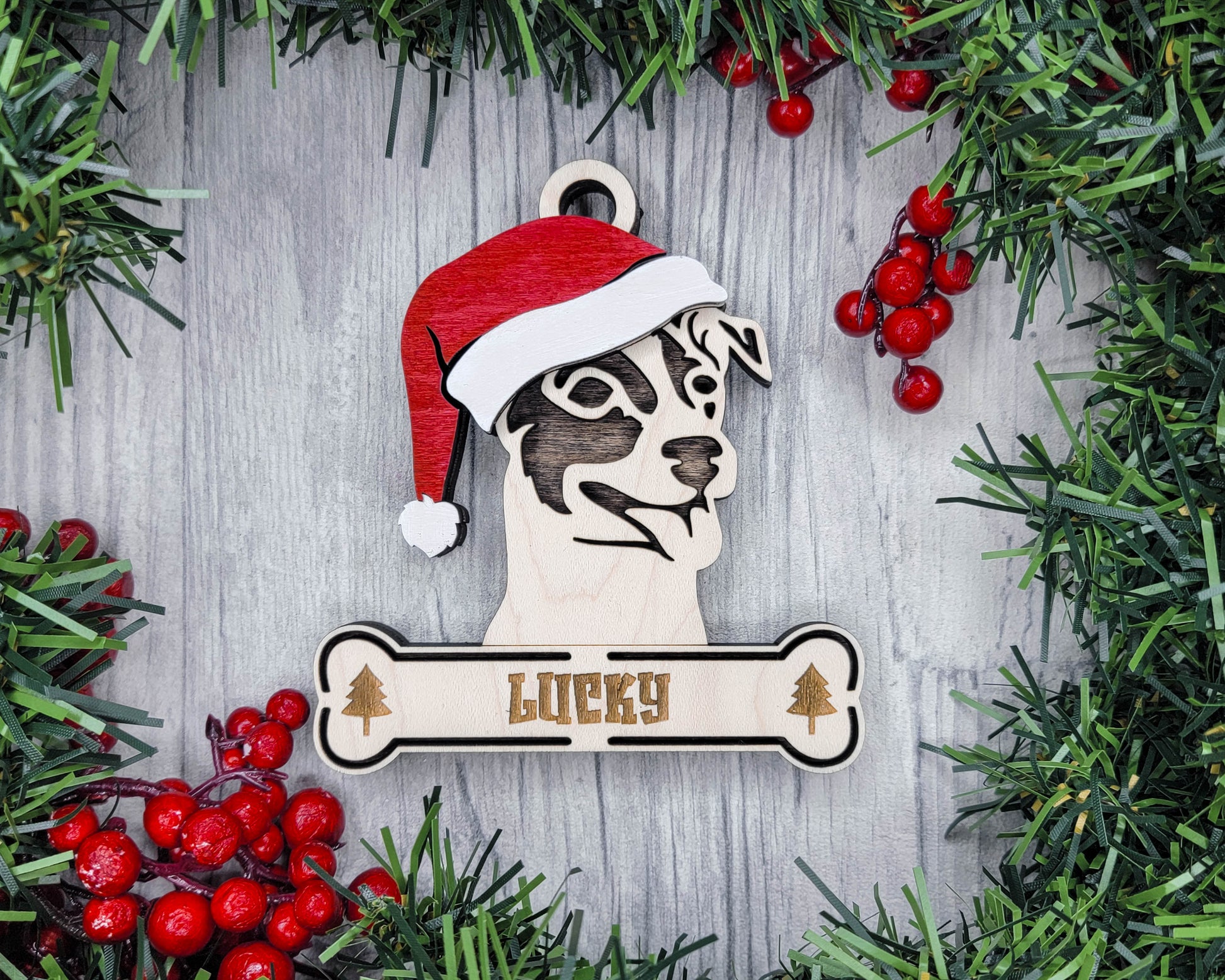 Bring the holiday cheer to your tree with the Santa Dogs ornament collection! Featuring popular dog breeds wearing festive Santa hats, these ornaments are perfect for celebrating your pup in true holiday style. Whether you're gifting to a dog lover or decking your own halls, these playful designs add a fun and personal touch to your decor. Each ornament is made of 3 layers and can be personalized with a sweet pup's name on the bone.