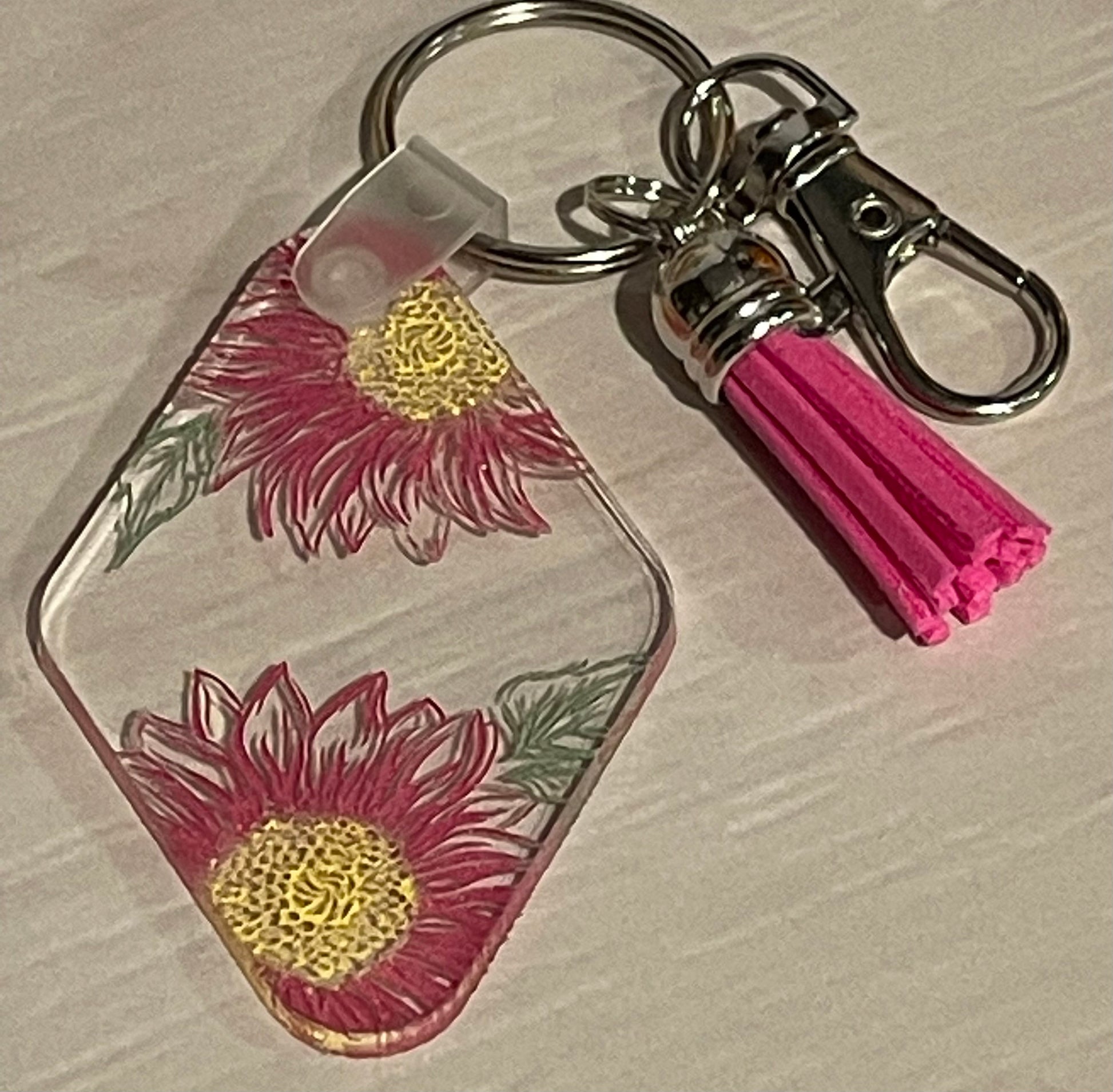 Sunflower Keychain, Engraved and Hand-painted Acrylic, Tassel, Lobster Claw Clasp, Lightweight