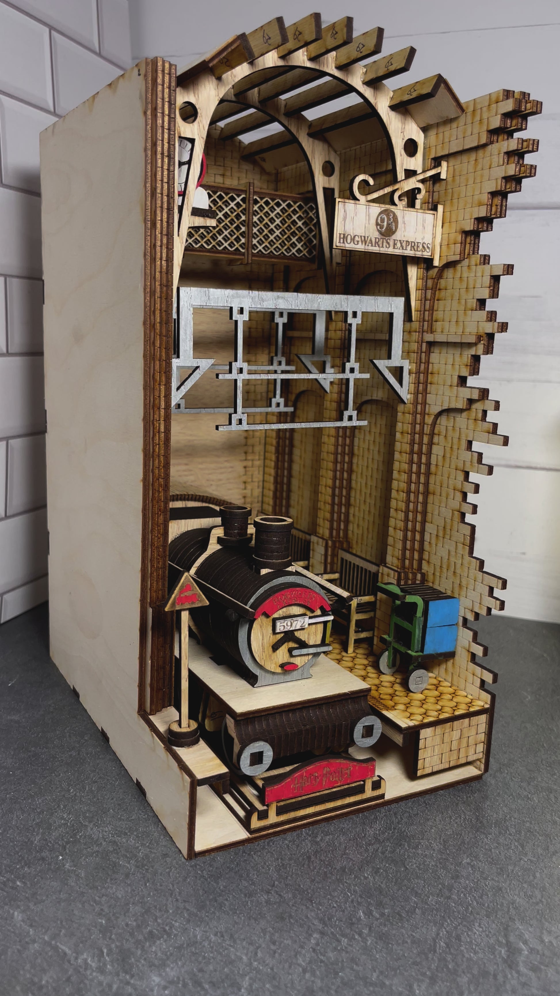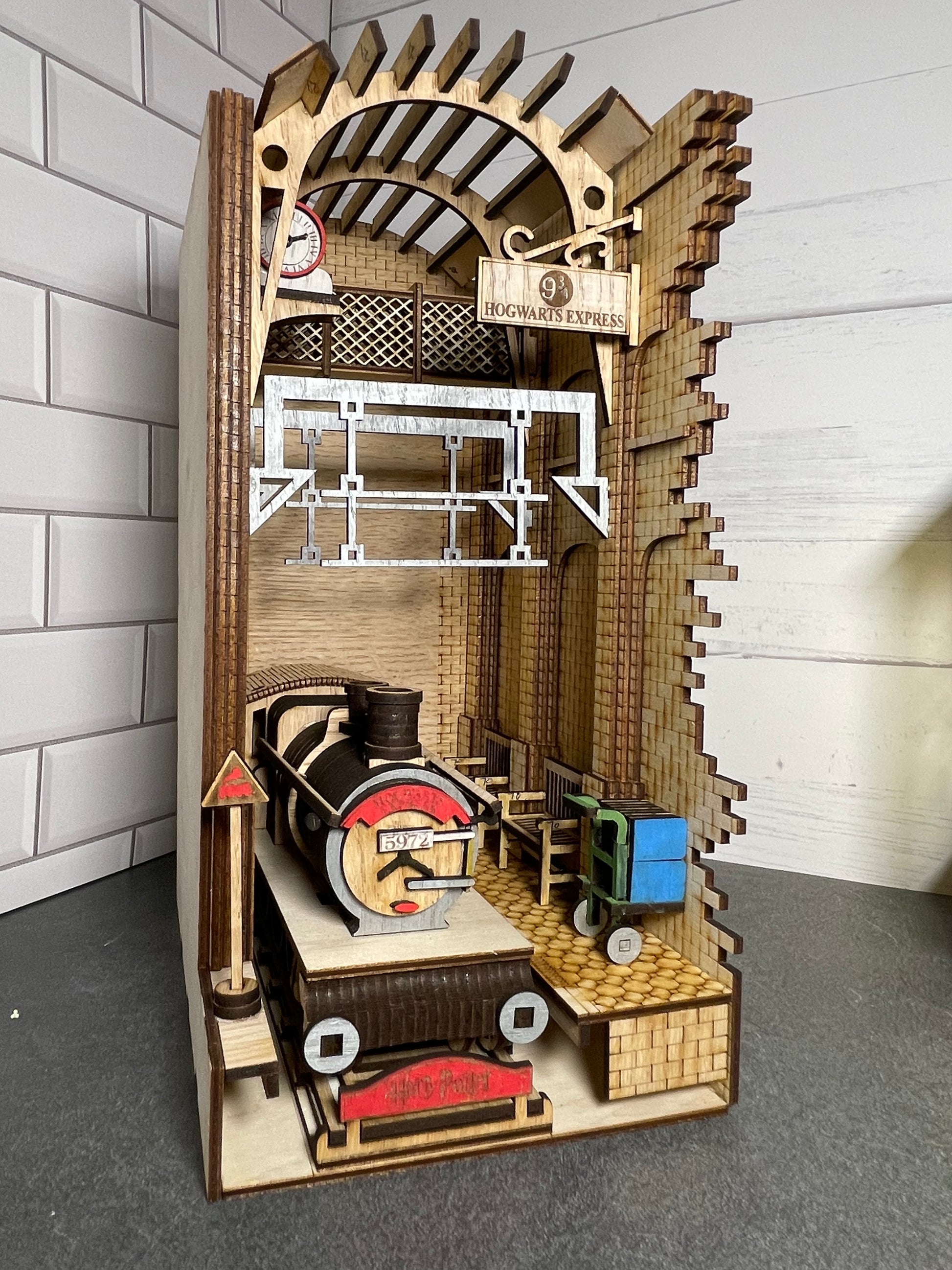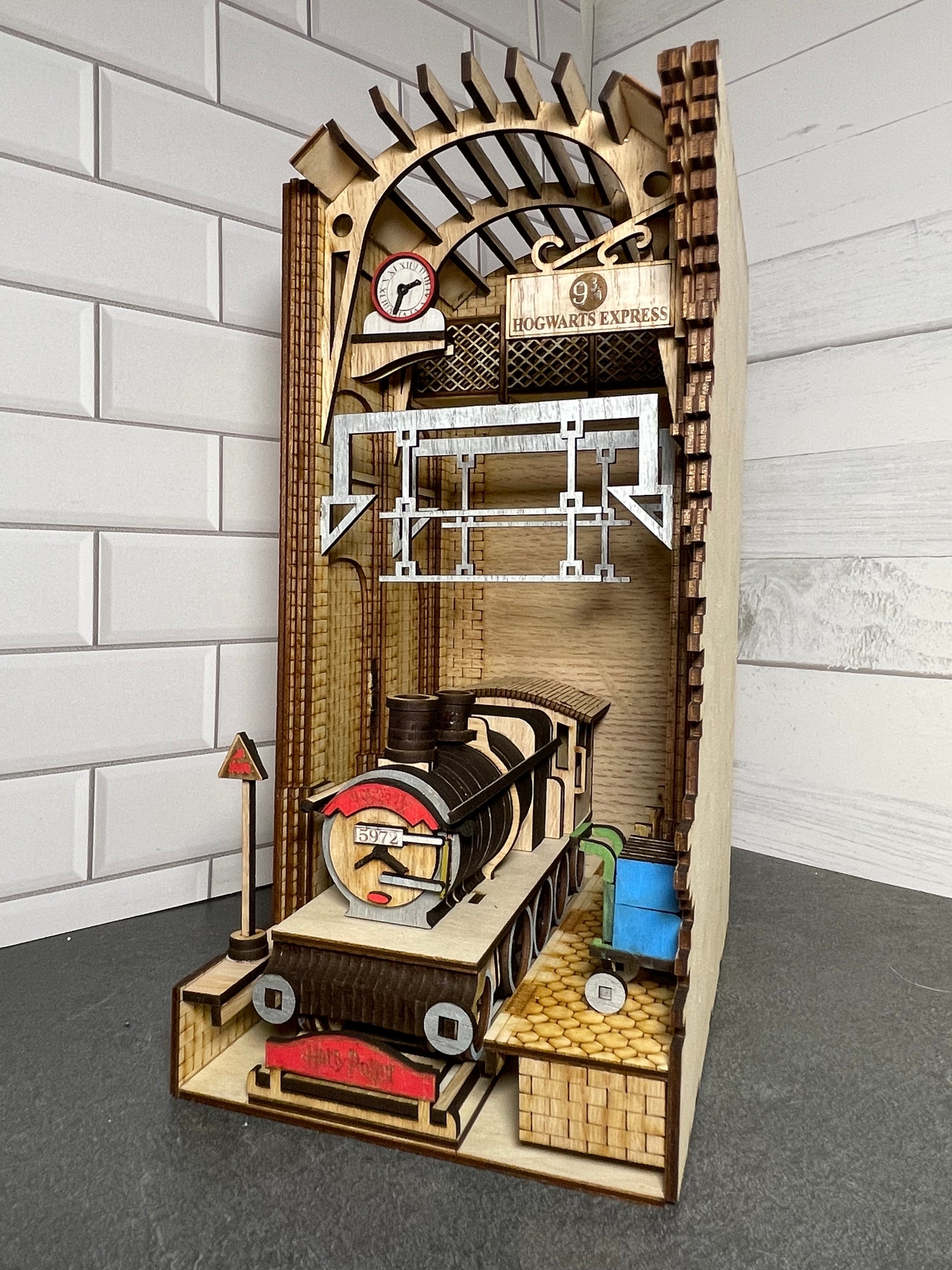 Introducing the Train Station Book Nook - a meticulously crafted piece with laser-cut precision out of premium wood. This must-have collection features a Hogwarts train station book nook, complete with references to the beloved wizarding movie. Perfect for any fan of the wizarding movies or of book lovers and collectors, this book nook adds a touch of magic and wonder to any space.