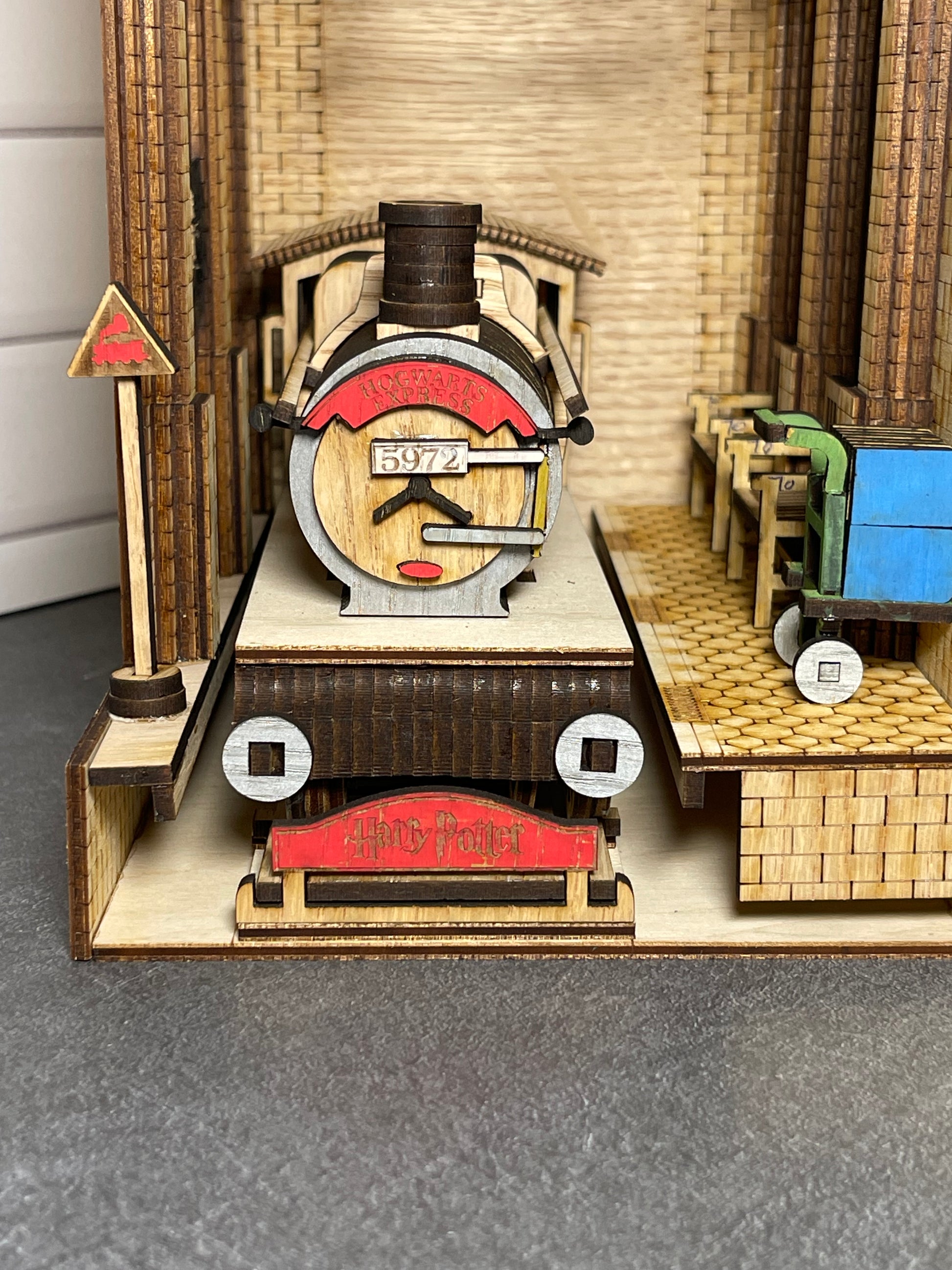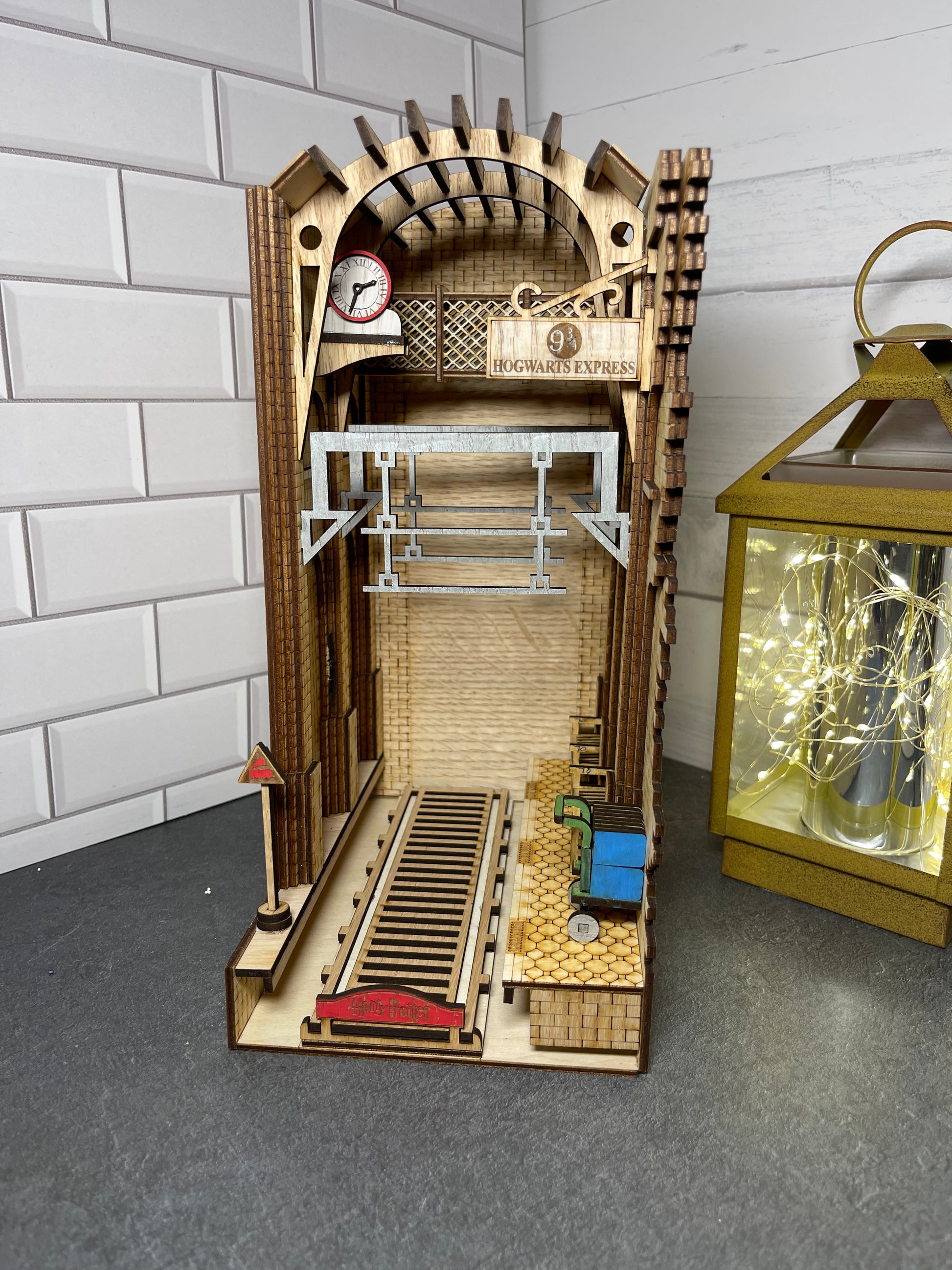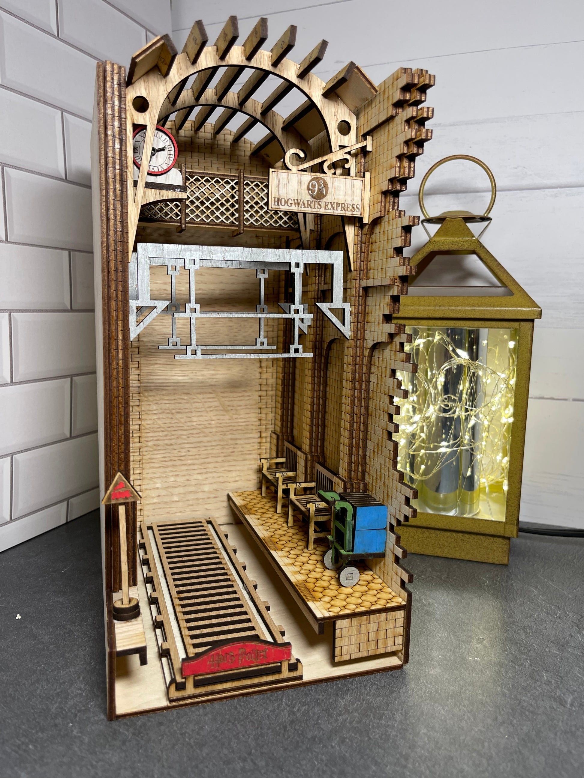 Introducing the Train Station Book Nook - a meticulously crafted piece with laser-cut precision out of premium wood. This must-have collection features a Hogwarts train station book nook, complete with references to the beloved wizarding movie. Perfect for any fan of the wizarding movies or of book lovers and collectors, this book nook adds a touch of magic and wonder to any space.