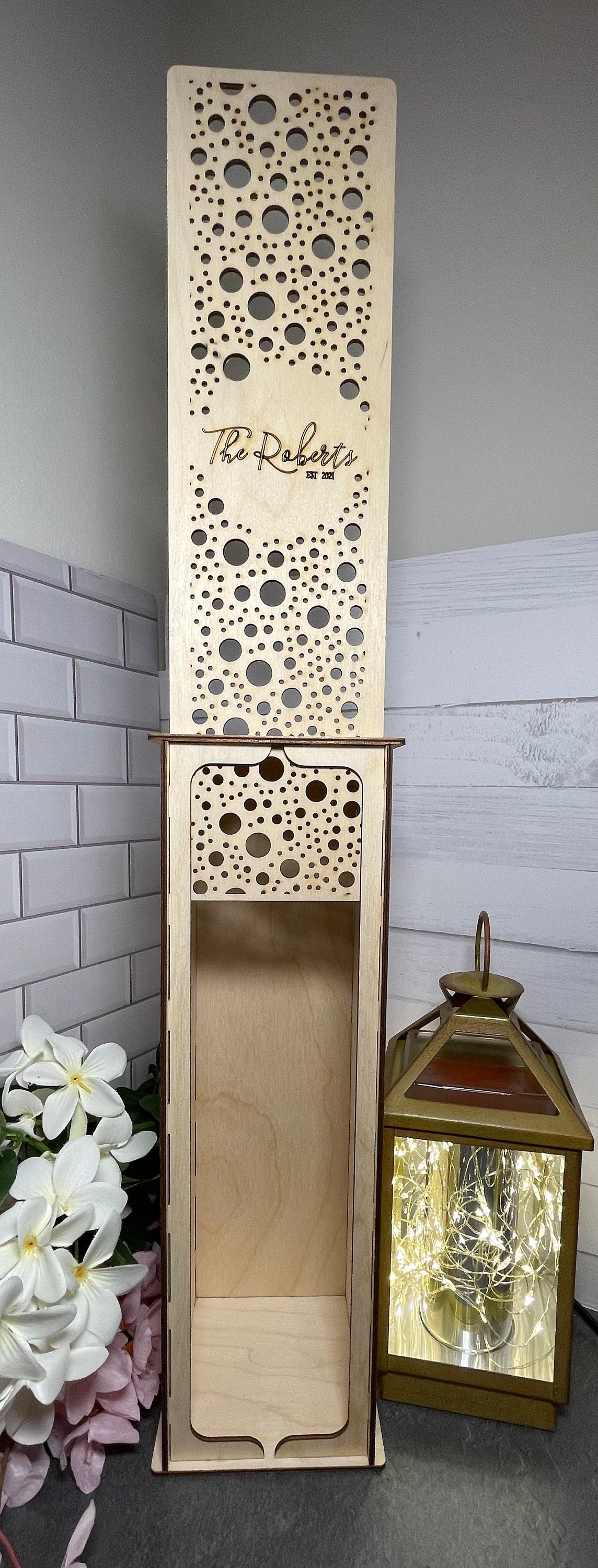 This beautiful wine box has a front cover that slides up to add a bottle of wine and slides down to hold it securely inside. It can be personalized to make it a more cherished gift. This is a keepsake item that will be displayed long after the bottle of wine is gone. It would make a great gift for a wedding, anniversary, Valentine's Day, birthday, Christmas, or as a "just because."