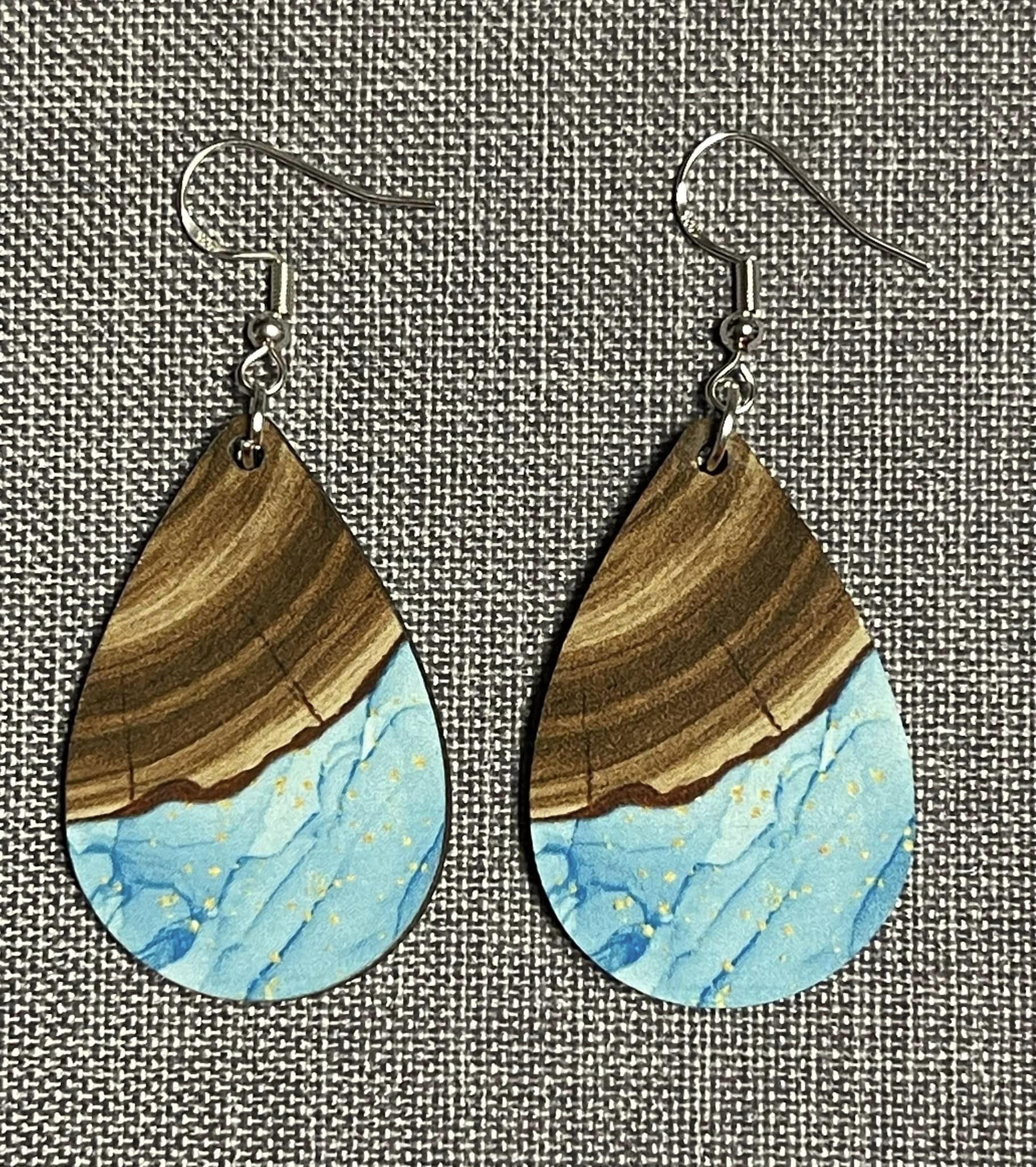 These lovely and classy dangle earrings feature a matching image on both sides. They are designed to look like they are made by joining wood and marble. They are very lightweight and measure about 2" tall.